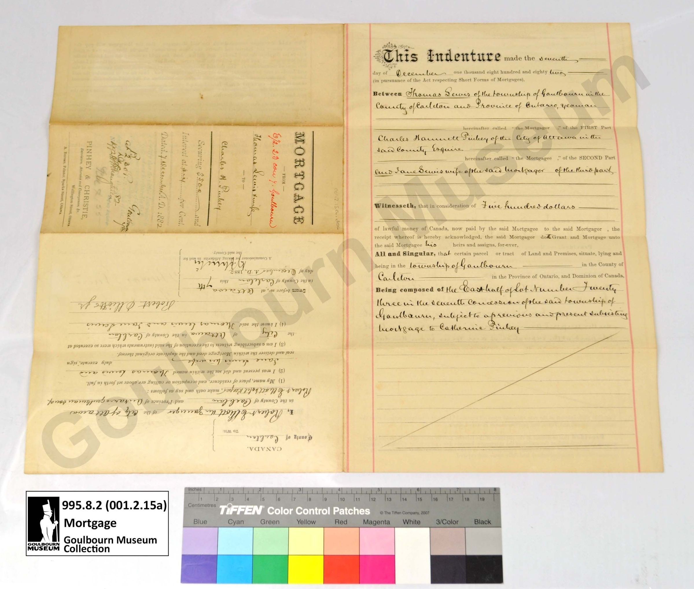 Folded paper Mortgage document for land identified as East half lot 23 concession 7, Goulbourn Township. The property is transferred from Thomas Lewis & Wife to Charles H. Pinhey. Securing $500 and interest at six percent. Dated 7 December A.D. 1882.Collection