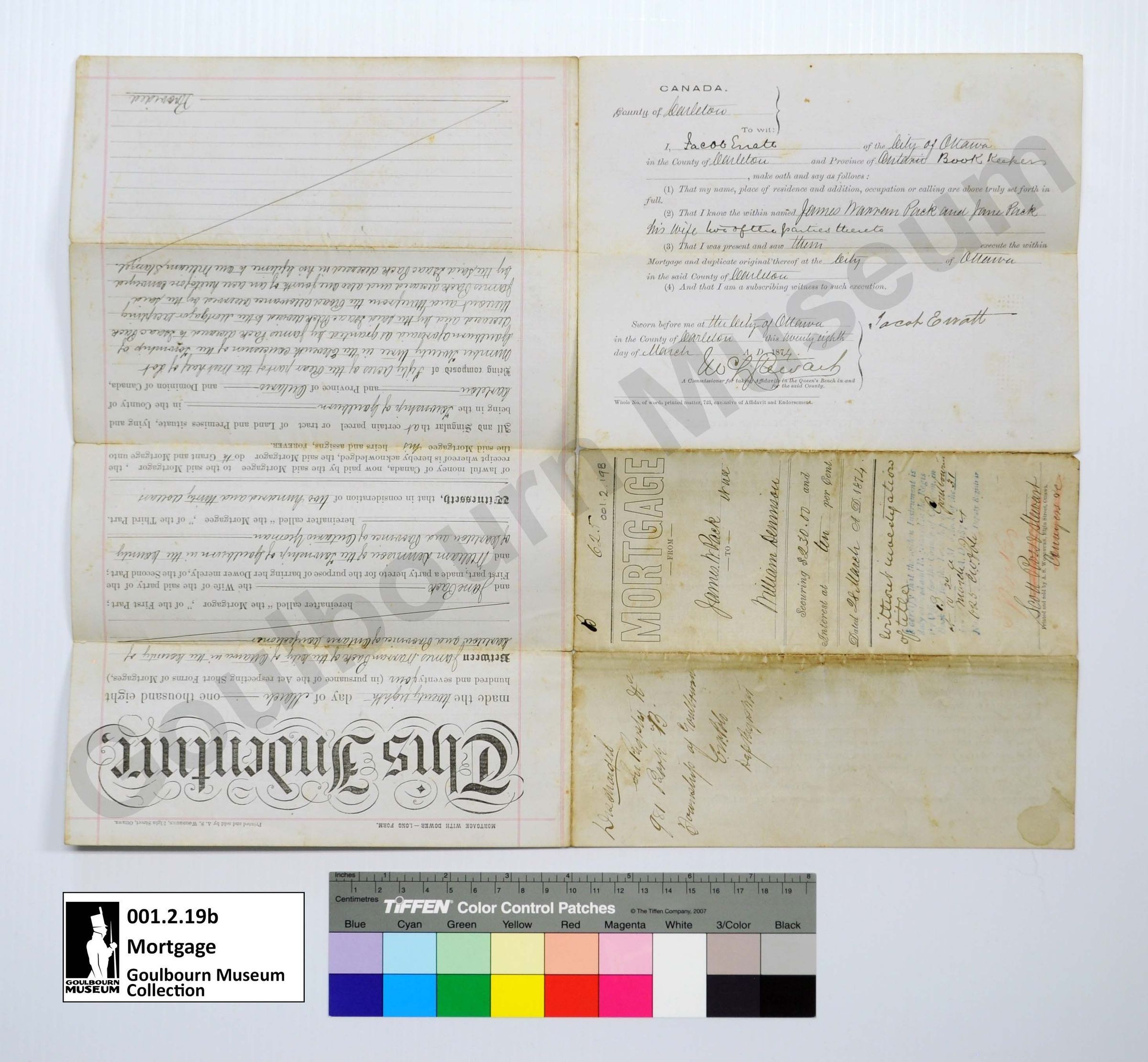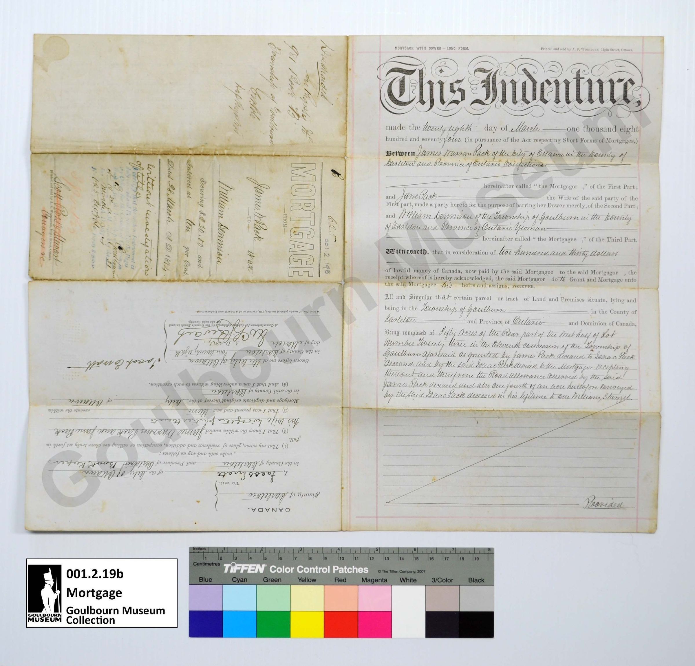 Mortgage from James. W. Pack and wife to William Dennison March 28, 1874.Collection