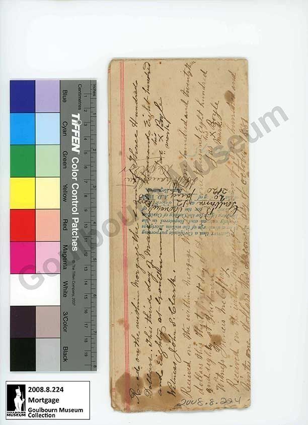The artefact is a pamphlet copy of a Mortgage between Thomas Featherston and James Boyle. The document describes the beginning of the mortgage in 1878 and the receipt of payment of the loan and interest in full in 1883.Collection