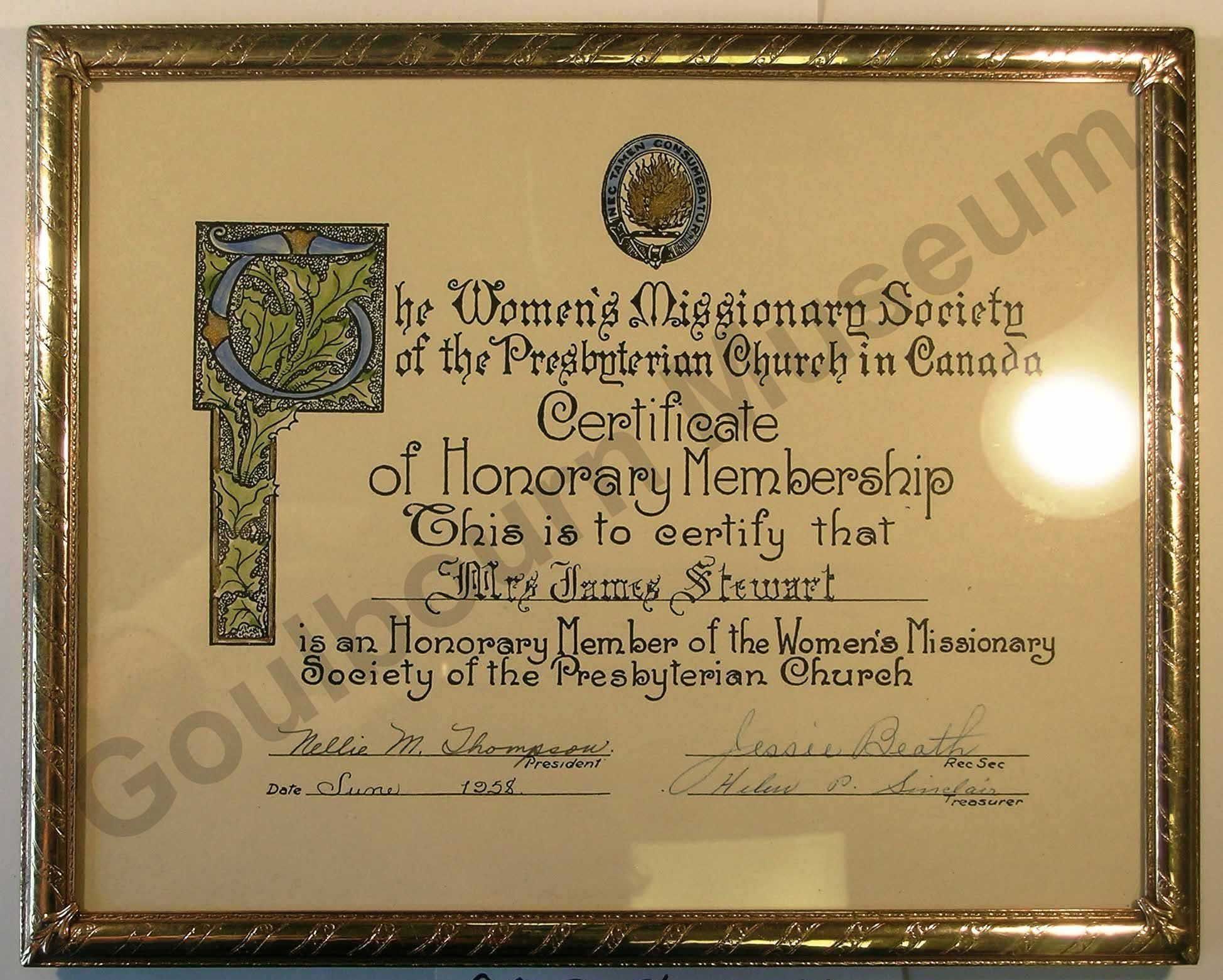 Paper membership certificate with illustrated, colour capital T. Reads: The Women's Missionary Society of the Presbyterian Church in Canada Certificate of Honorary Membership This is to certify that Mrs. James Stewart is an Honorary Member of the Women's Missionary Society of the Presbyterian Church Nellie M. Thompson (signature) President Jessie Beath (signature) RecSec Date: June 1958 Helen P. Sinclair(signature) Treasurer. In gilt frame 008.8.105.