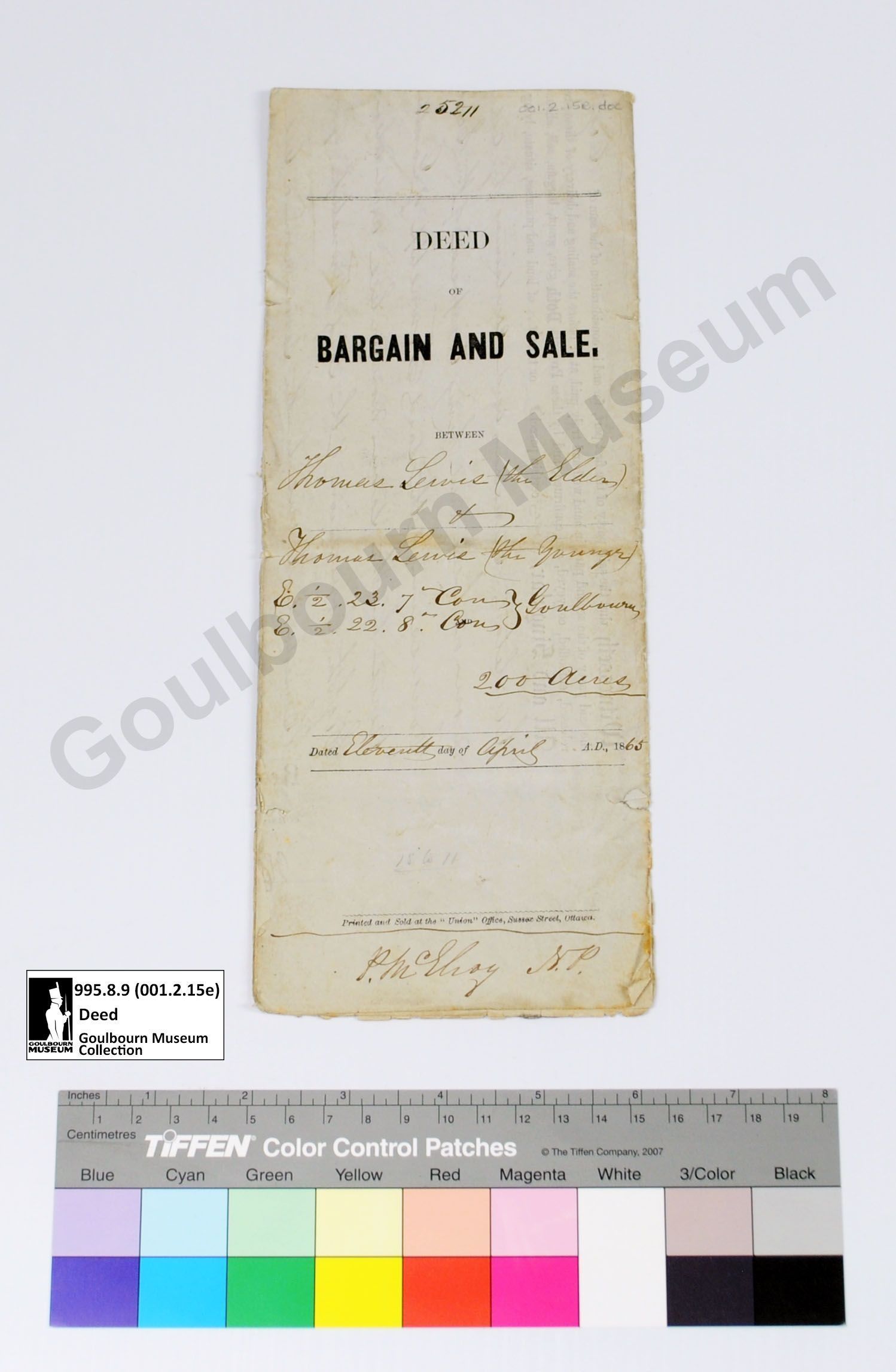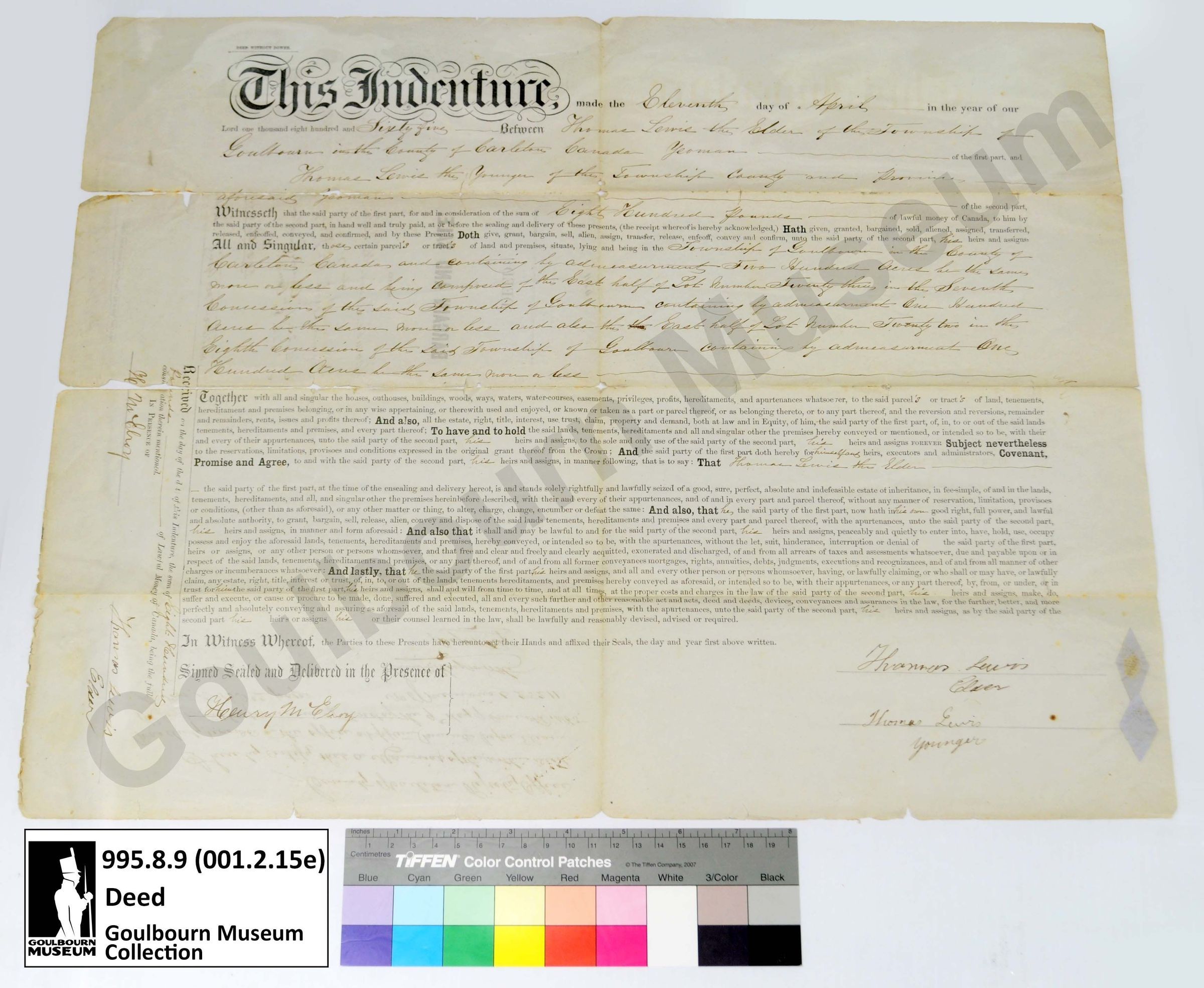 Muniment: Deed, Thomas Lewis (SR) and Thomas Lewis (JR), E1/2 lot 23 7 Concession, E1/2 lot 22 8 Concession, GoulbournEntry/Object ID