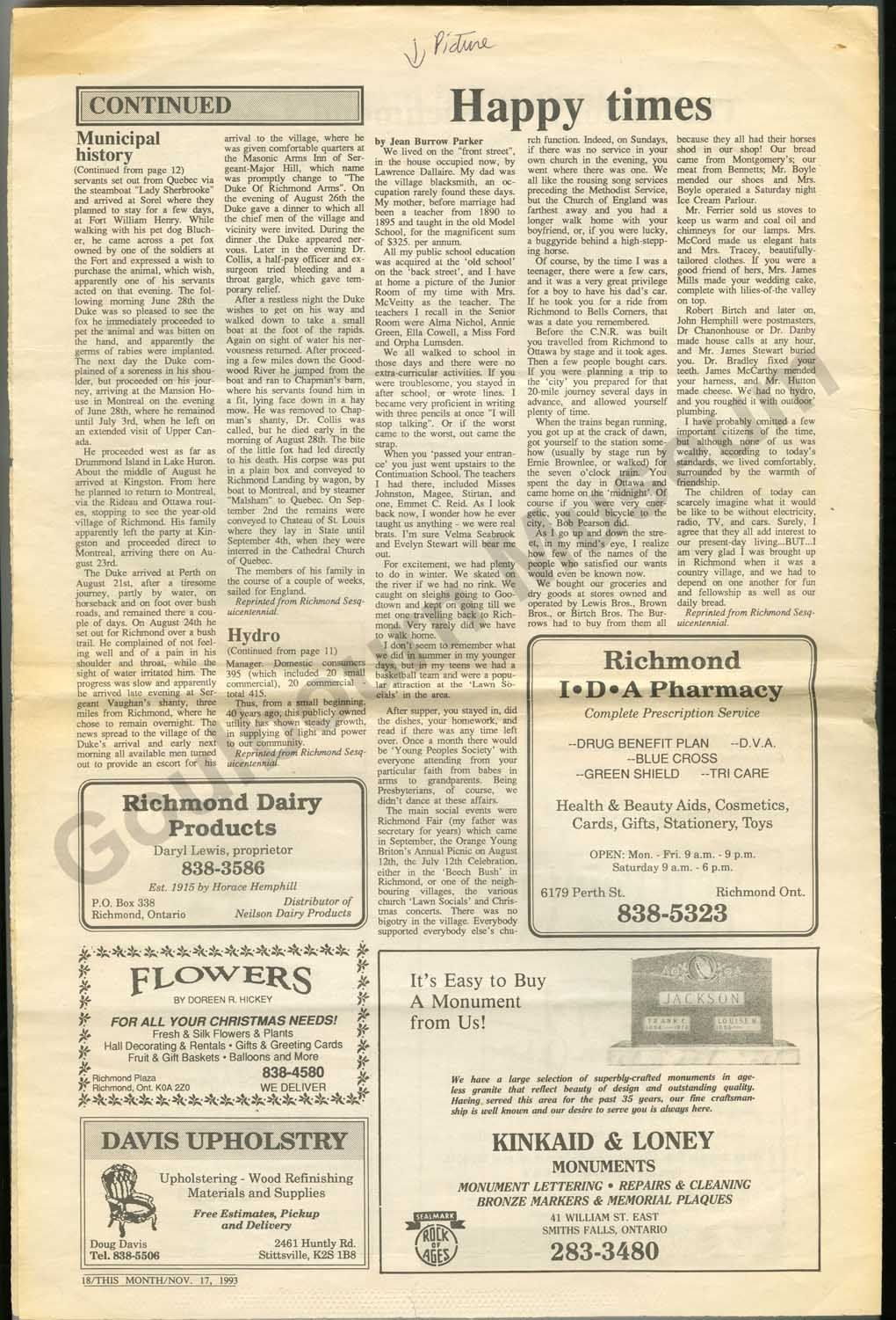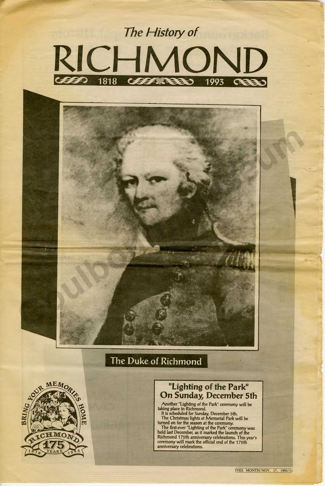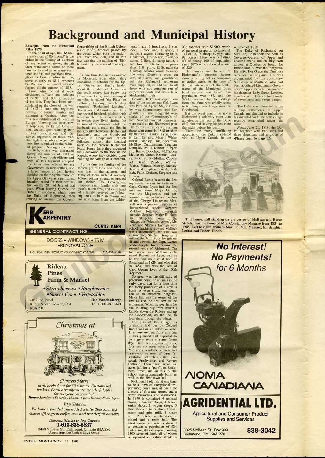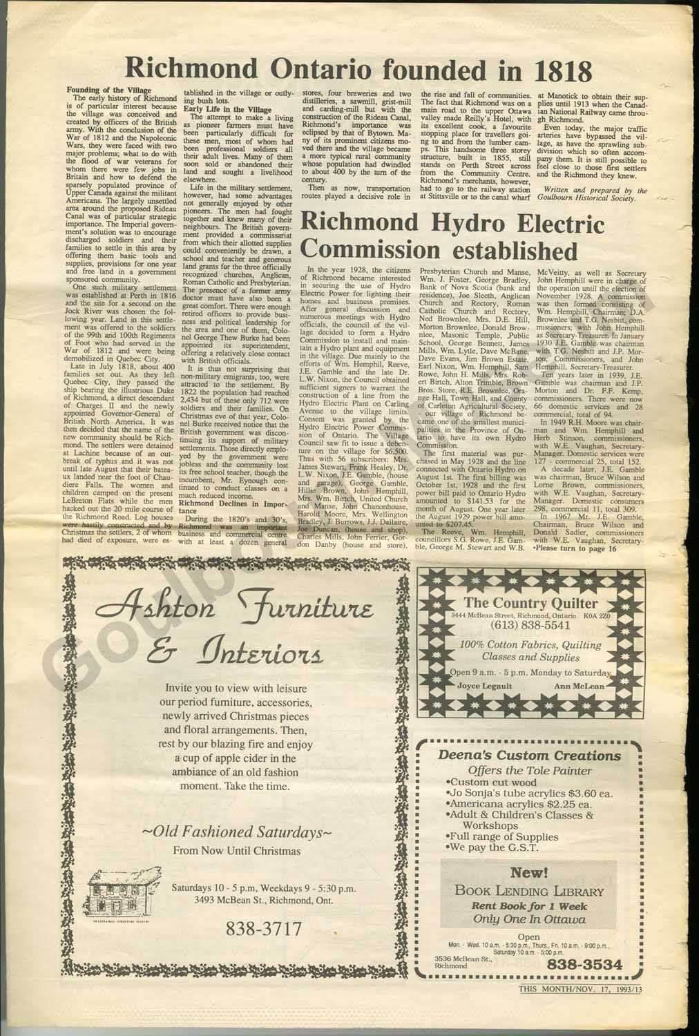 Special edition newspaper entitled, "History of Richmond 1818-1993." The paper consists of two folded pieces of paper with articles about the history of Richmond including, "Background and Municipal History," "Richmond Ontario Founded in 1818," "Richmond Hydro Electric Commission established," "Richmond Agricultural Society," "Canadian Northern Railway in Richmond," "Rielly House - best hotel in Eastern Ont.," "The history of Richmond's Bakery,"and "Happy Times." The paper also features local business advertisements.Collection