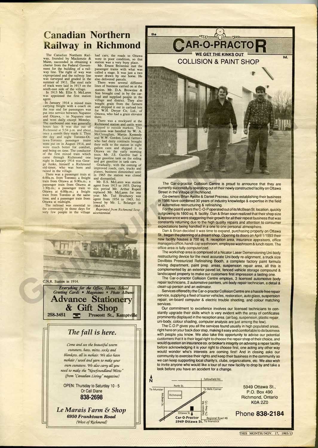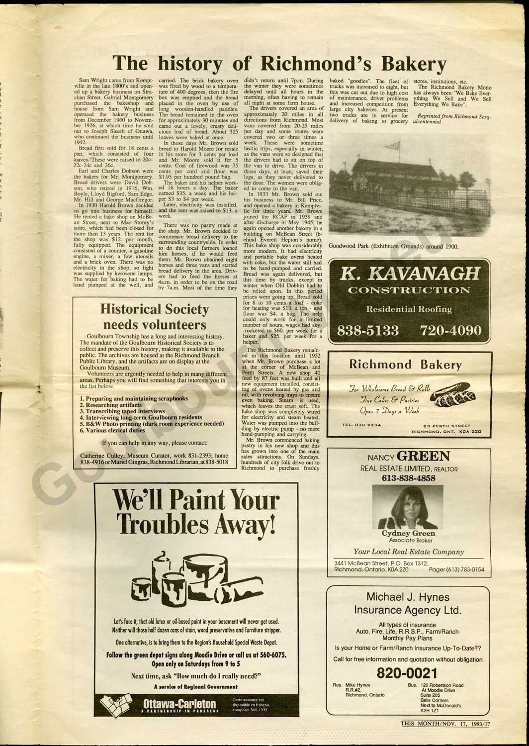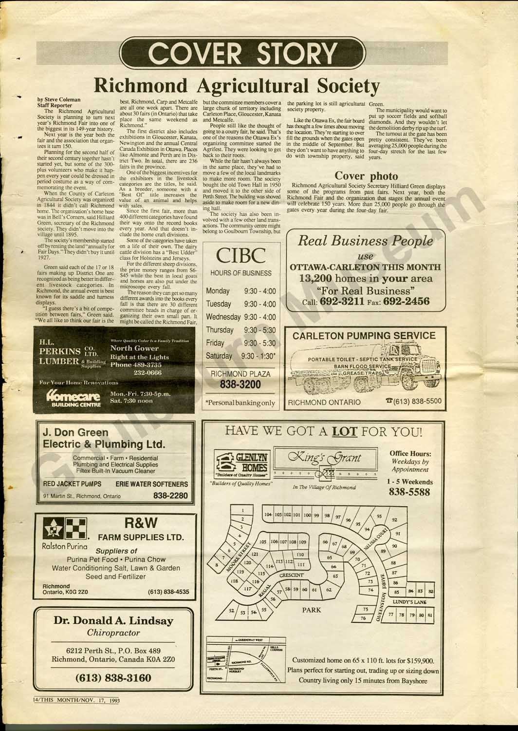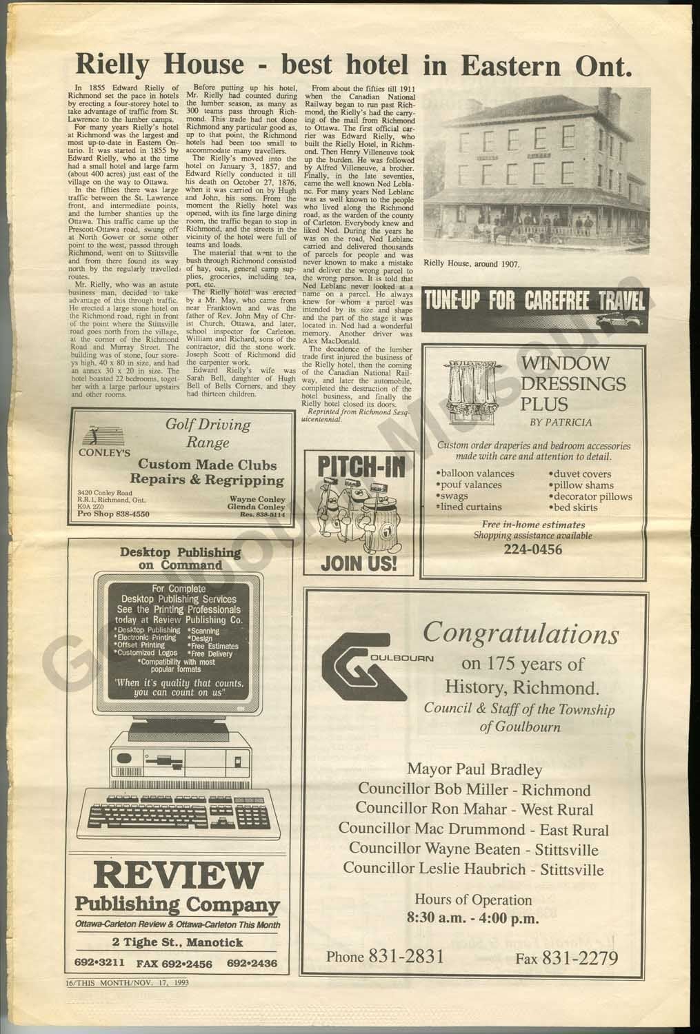 Special edition newspaper entitled, "History of Richmond 1818-1993." The paper consists of two folded pieces of paper with articles about the history of Richmond including, "Background and Municipal History," "Richmond Ontario Founded in 1818," "Richmond Hydro Electric Commission established," "Richmond Agricultural Society," "Canadian Northern Railway in Richmond," "Rielly House - best hotel in Eastern Ont.," "The history of Richmond's Bakery,"and "Happy Times." The paper also features local business advertisements.Collection