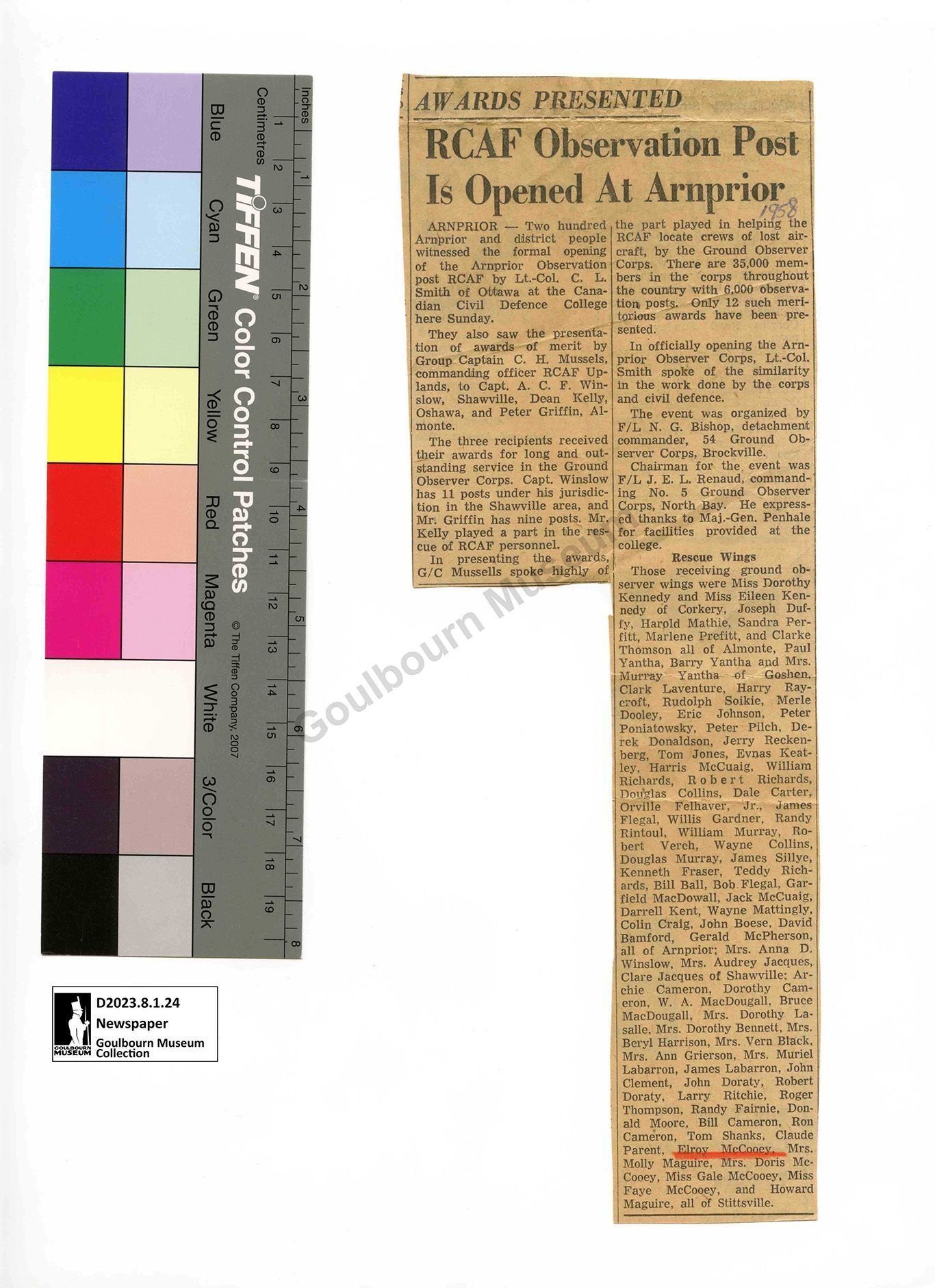 Ground Observer Corps, Royal Canadian Air Force, Canadian Armed Forces, Elroy McCooeye, Archie Cameron, Dorothy Cameron, W.A. MacDougall, Bruce MacDougall, Mrs. Dorothy Lasalle, Mrs. Dorothy Bennett, Mrs. Beryl Harrison, Mrs. Vern Black, Mrs. Ann Grierson, Mrs. Muriel Labarron, James Labarron, John Clement, John Doraty, Robert Doraty, Larry Ritchie, Roger Thompson, Randy Fairnie, Donald Moore, Bill Cameron, Ron Cameron, Tom Shanks, Claude Parent, Mrs. Molly Maguire, Mrs. Doris McCooeye, Mrs. Gale McCooeye, Miss. Faye McCooeye, Howard Maguire