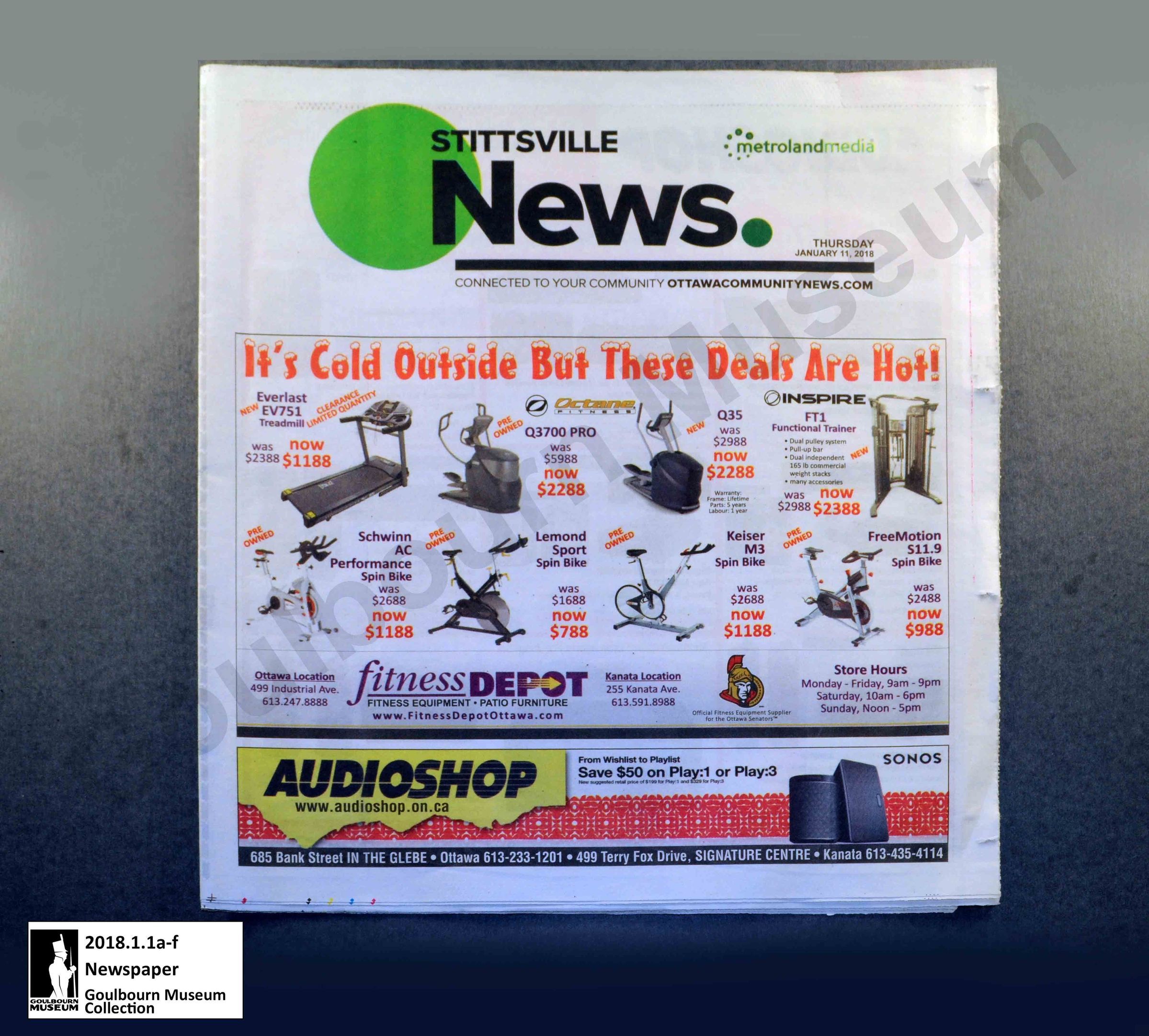 The newspaper is printed on white newsprint paper, with no border or other design around the edges. At the top, in a large bold font, it reads "Stittsville News, metrolandmedia, Thursday, January 11, 2018, Connected to your community Ottawacommunitynews.com". Below that is a large list of items related to fitness and exercise that are advertised for sale. Below that are advertisements for Audioshop. The newspapers logo has a large green circle near the upper proper right of the paper. The reverse side of the paper shows an advertisement and description of a new living area in Stittsville called Hazeldean Gardens. The paper contains Stittsville news articles as well as articles about key figures in the history of the Stittsville News publication. There are no other distinguishable features. The newspaper is composed of six pages labelled "a" through "f".Context