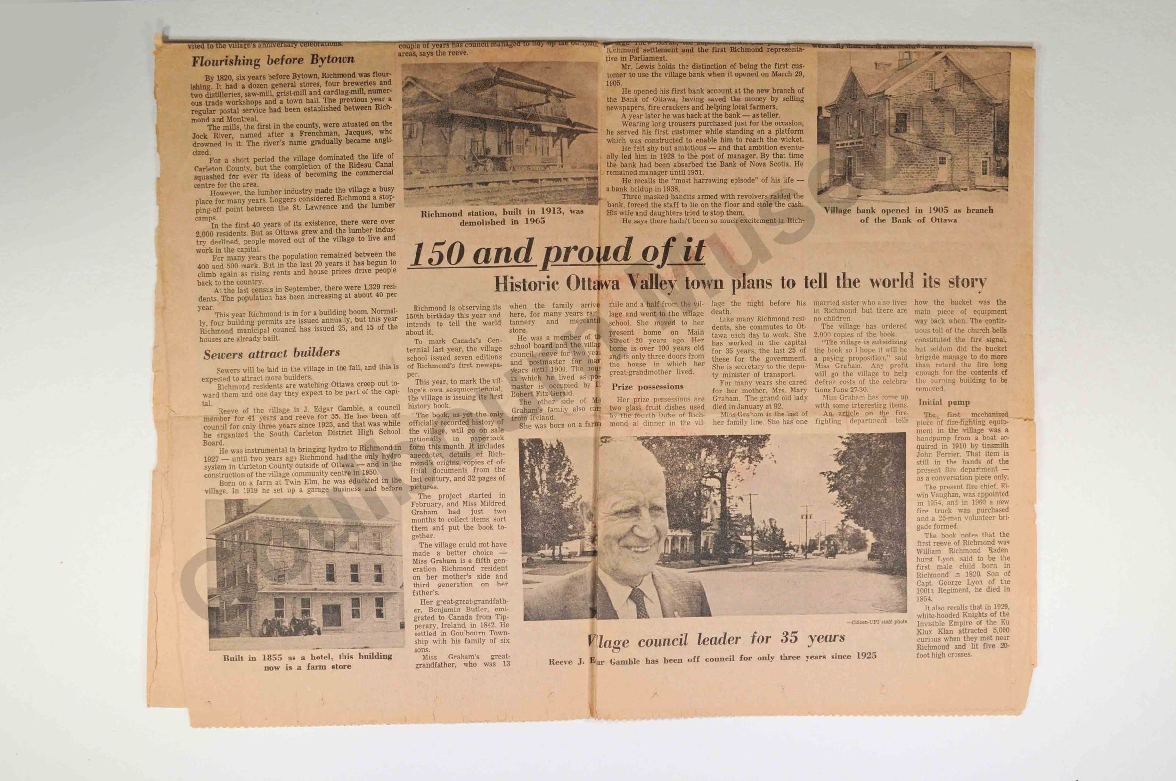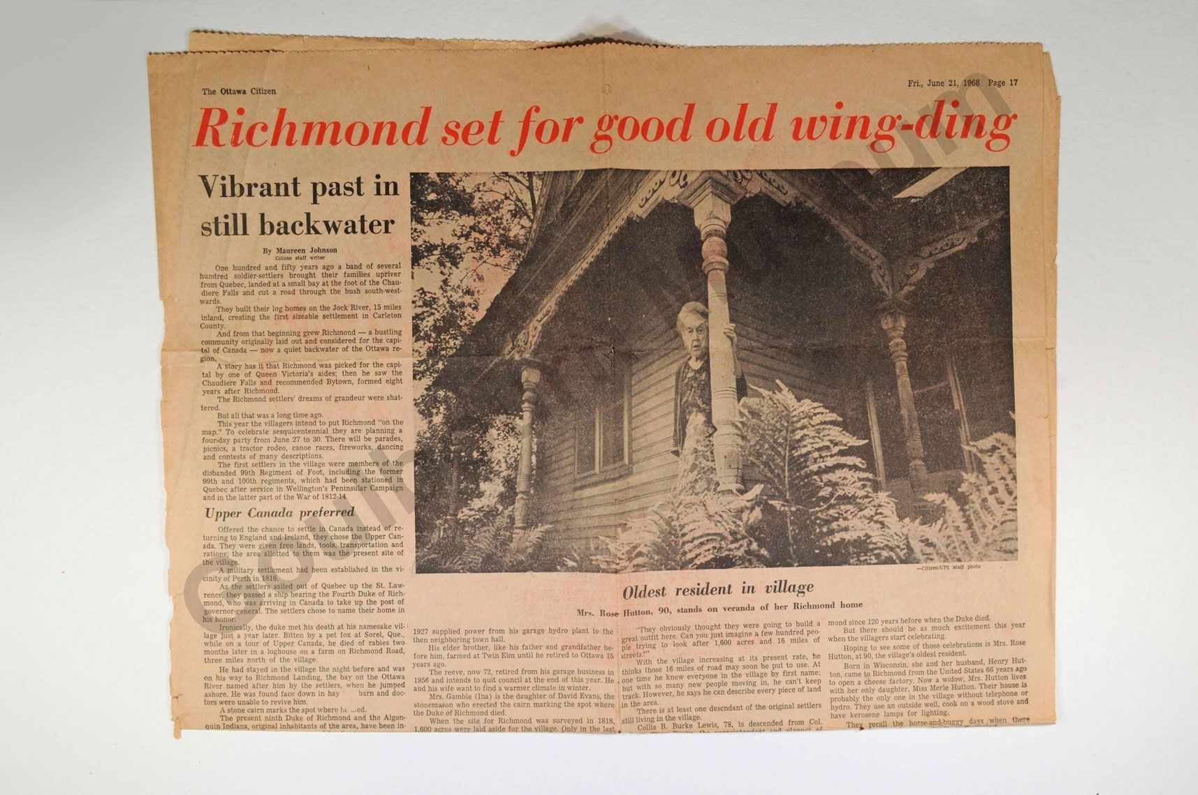 Article about Hutton family who lived next door to Stewart family. Published in the Ottawa Citizen June 21 1968. Mr. Hutton was the treasurer of the Presbyterian Church. He operated a cheese factory as well. In the photo Mrs. Hutton is elderly. Her daughter was a friend of Evyleen Stewart. Mrs. Hutton also sang in the choir in Richmond.Collection