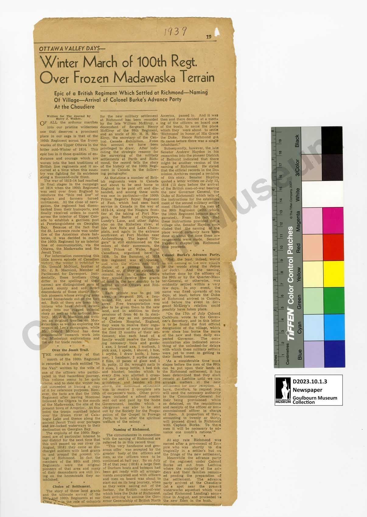 Newspaper clipping with the article title, "Ottawa Valley Days - Winter March of 100th Regt. [Regiment] Over Frozen Madawaska Terrain." The subtitle reads, "Epic of a British Regiment Which Settled at Richmond - Naming of Village - Arrival of Colonel Burke's Advance Party At the Chaudiere." The page number 19 is visible in the top right of the clipping, and 1939 has been hand written in ink at the top right corner.Collection