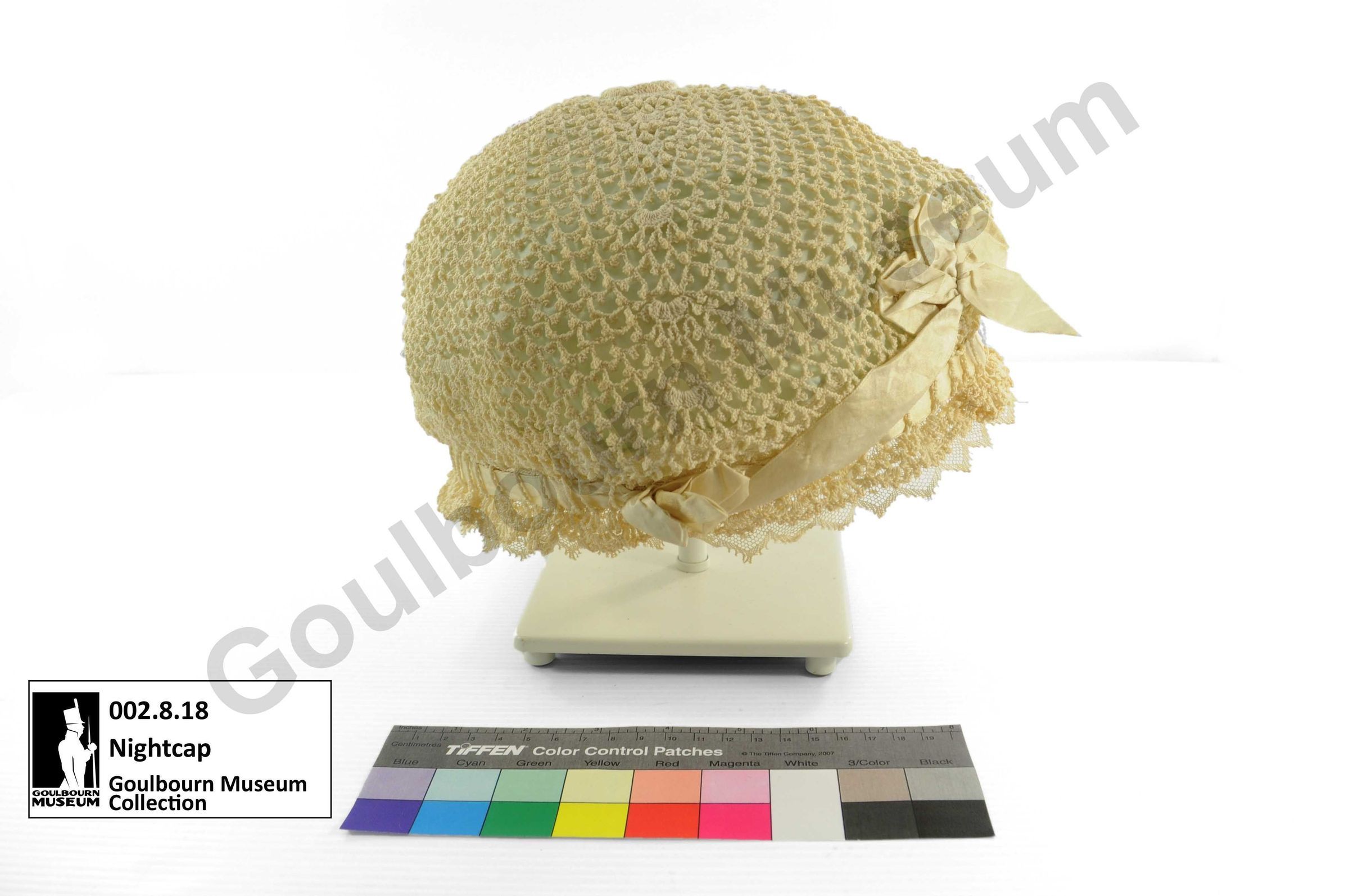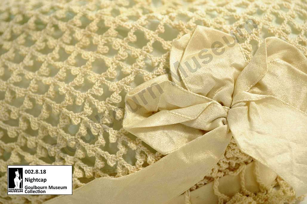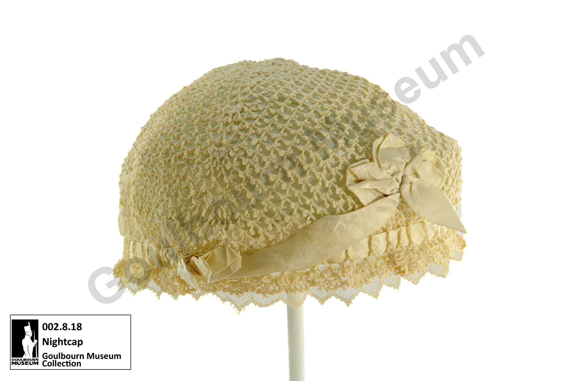 This is a silk nightcap. This artefact from the Museum’s collection would have been made between 1900 and 1910 and has a light green silk interior, cream coloured crochet lace, and a cream coloured satin ribbon decoration. Nightcaps like this one would have been used to protect the popular curled hairstyles of the early 1900s as the wearer slept. Silk caps, scarves, bonnets, and pillowcases continue to be used to protect the health of curly hair.Lexicon