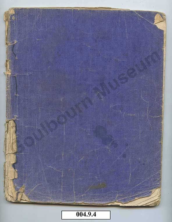 One blue soft-cover notebook with stitched binding, with ink notes about history written by Sterling James.