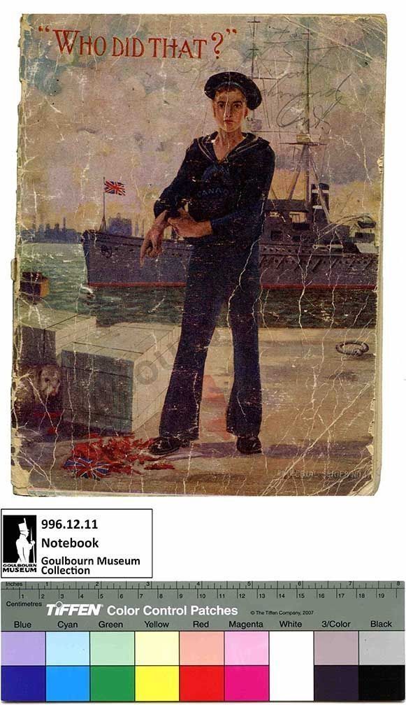 Note book with a picture of a young sailor, standing onshore with a large war ship behind him. The ship is flying a British flag. Title on the book is "Who Did That?" The back cover has arithmetical tables on it.Context