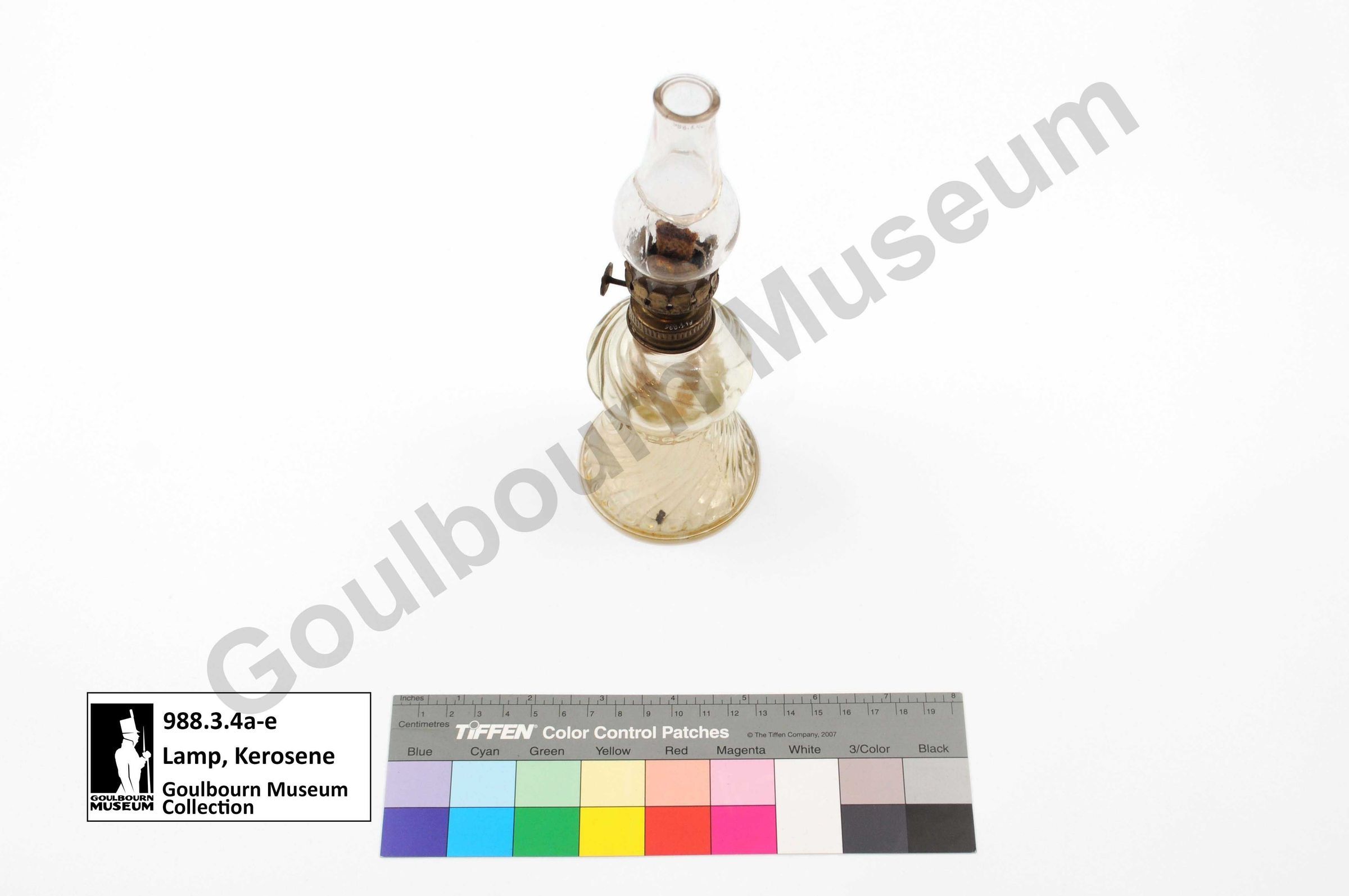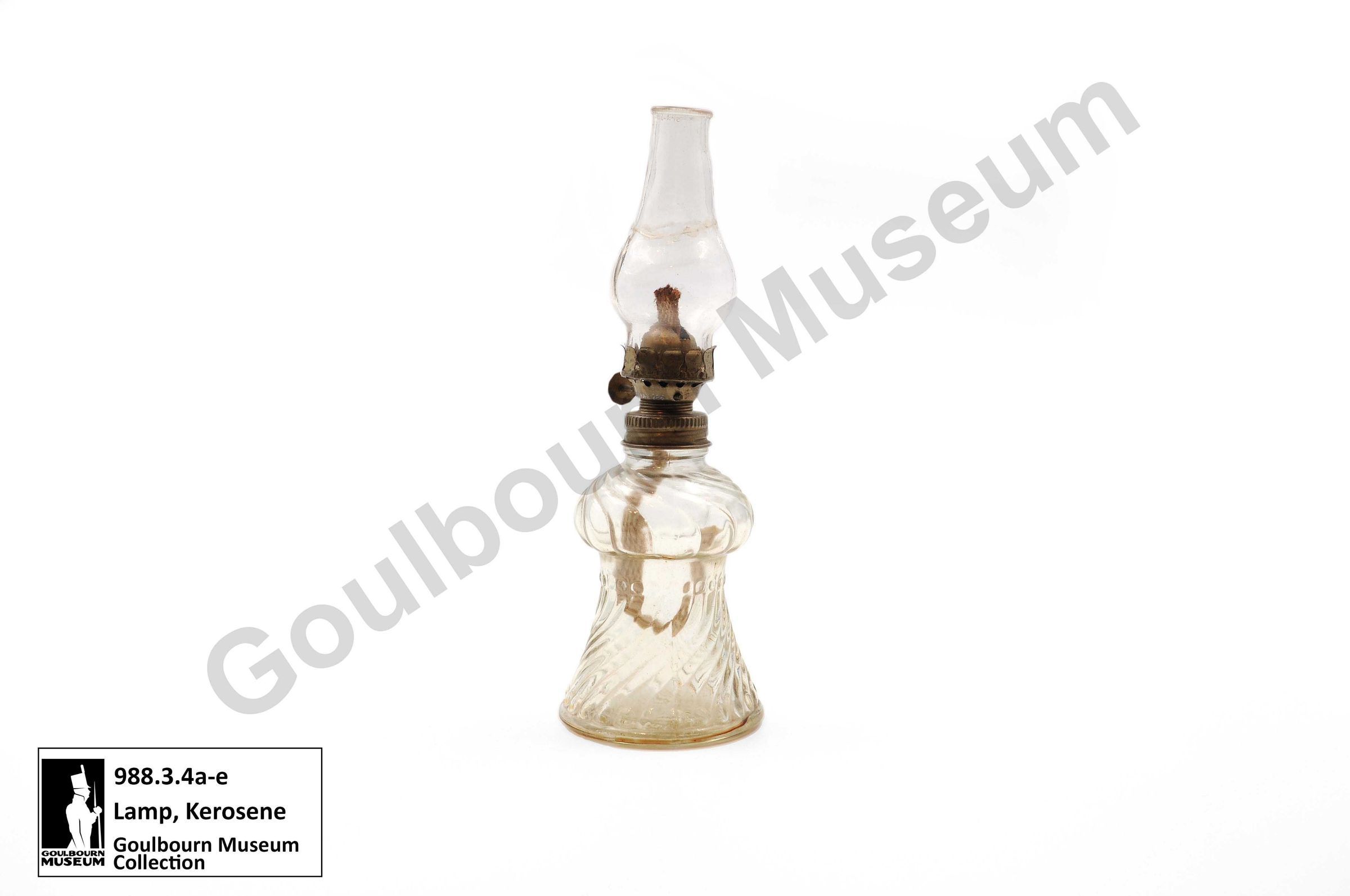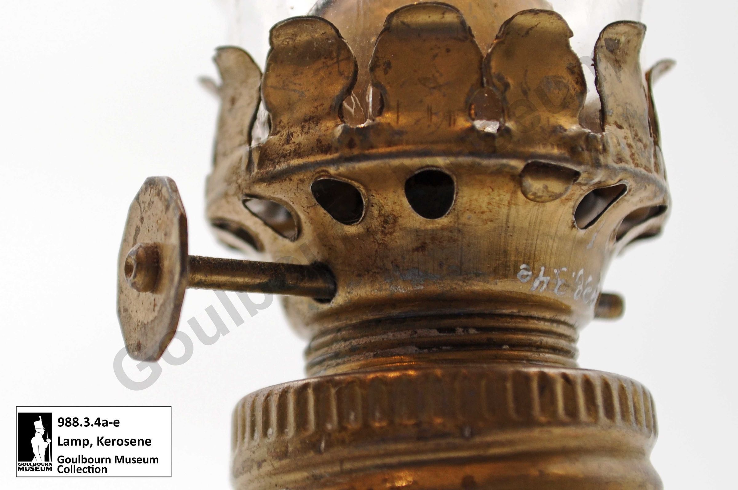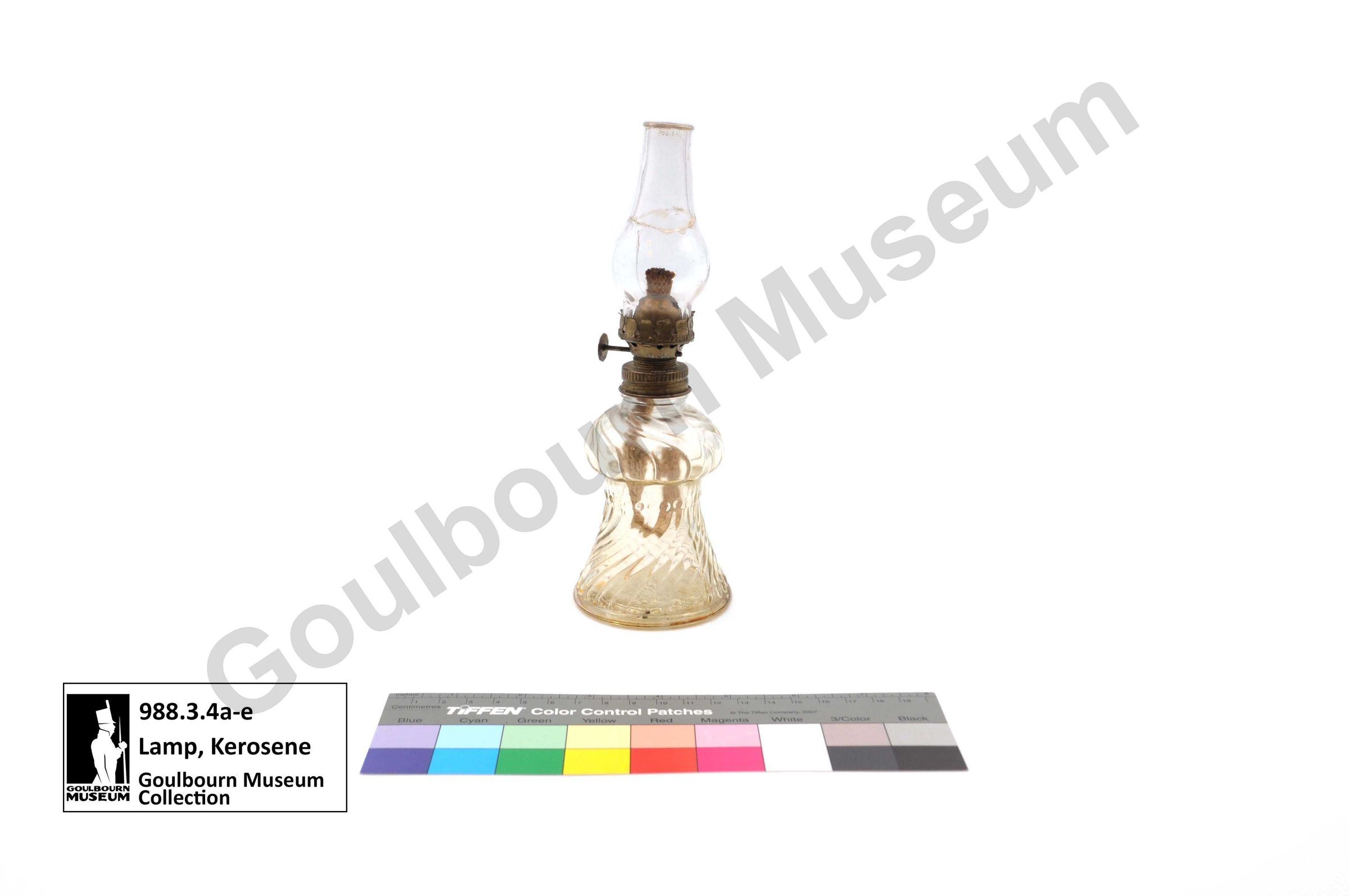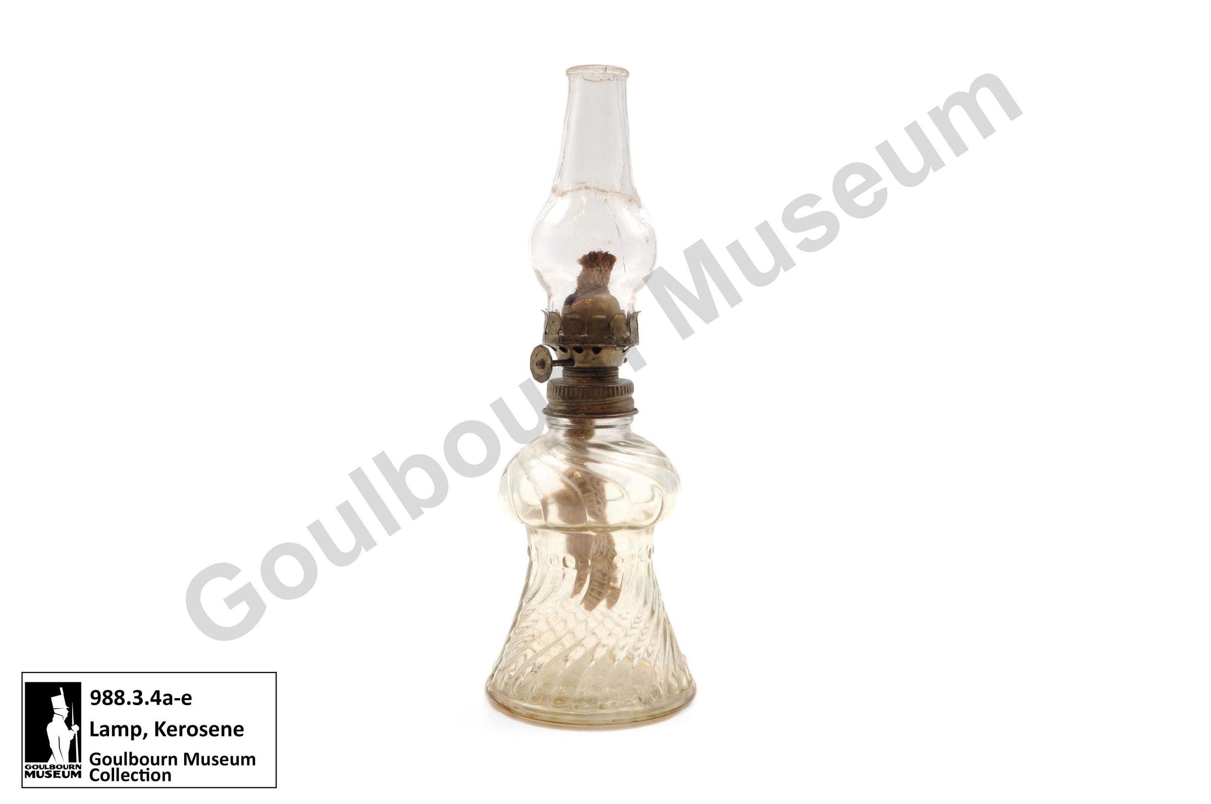 Clear glass oil lamp raised swirl decoration brass coated metal screwtop, turn knob mechanisums and chimmerbase. small glass base has raised 5 in octagon on underside.Lexicon