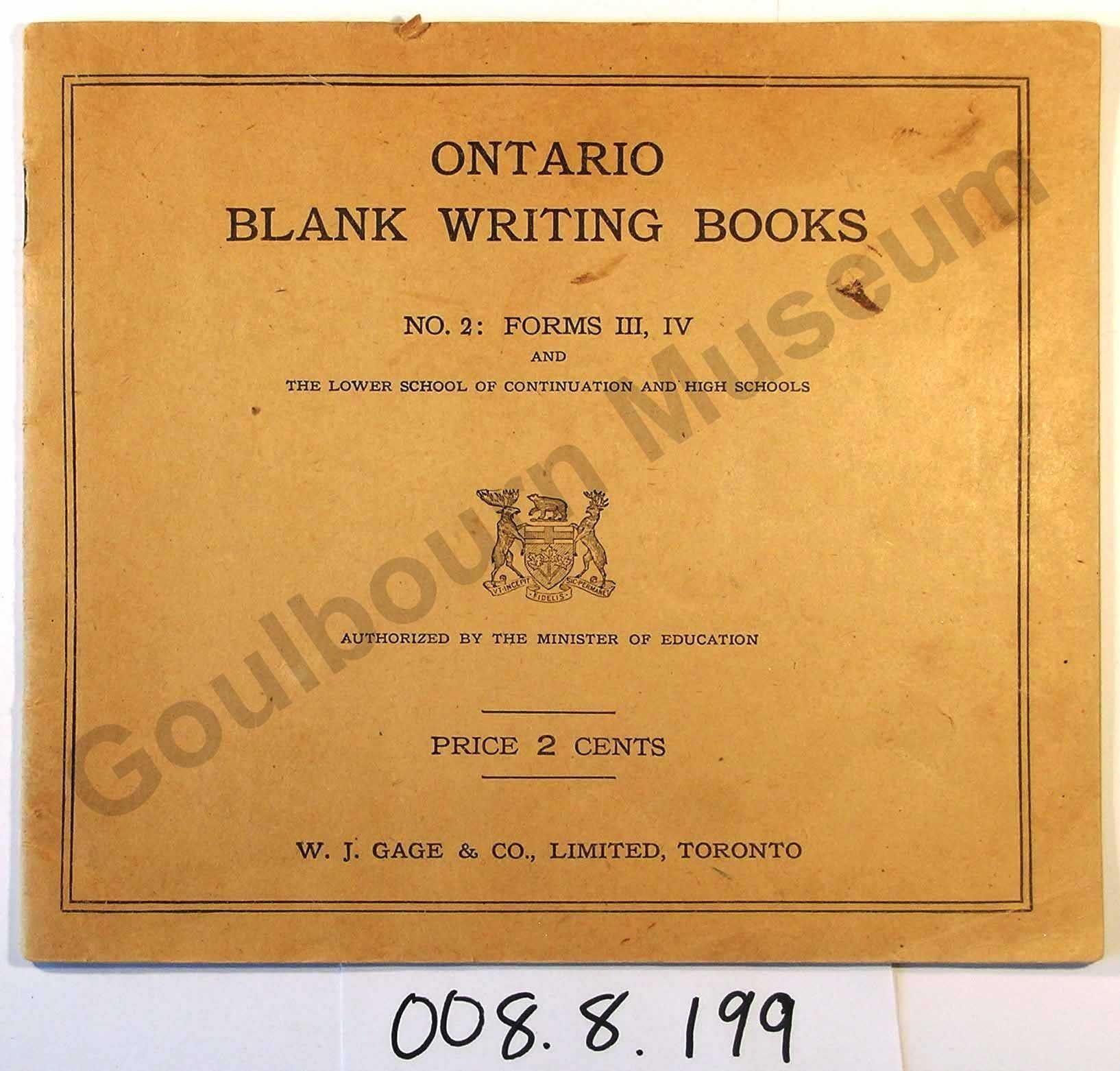 One paper writing/exercise book with stapled binding. Front cover inscription: ONTARIO BLANK WRITING BOOKS NO.2: FORMS III, IV AND THE LOWER SCHOOL OF CONTINUATION AND HIGH SCHOOLS [coat of arms of Ontario] AUTHORIZED BY THE MINISTER OF EDUCATION PRICE 2 CENTS W.J. GAGE & CO., LIMITED, TORONTO. 1916. Lined pages with ink inscriptions, mostly handwriting practice.Made/Created