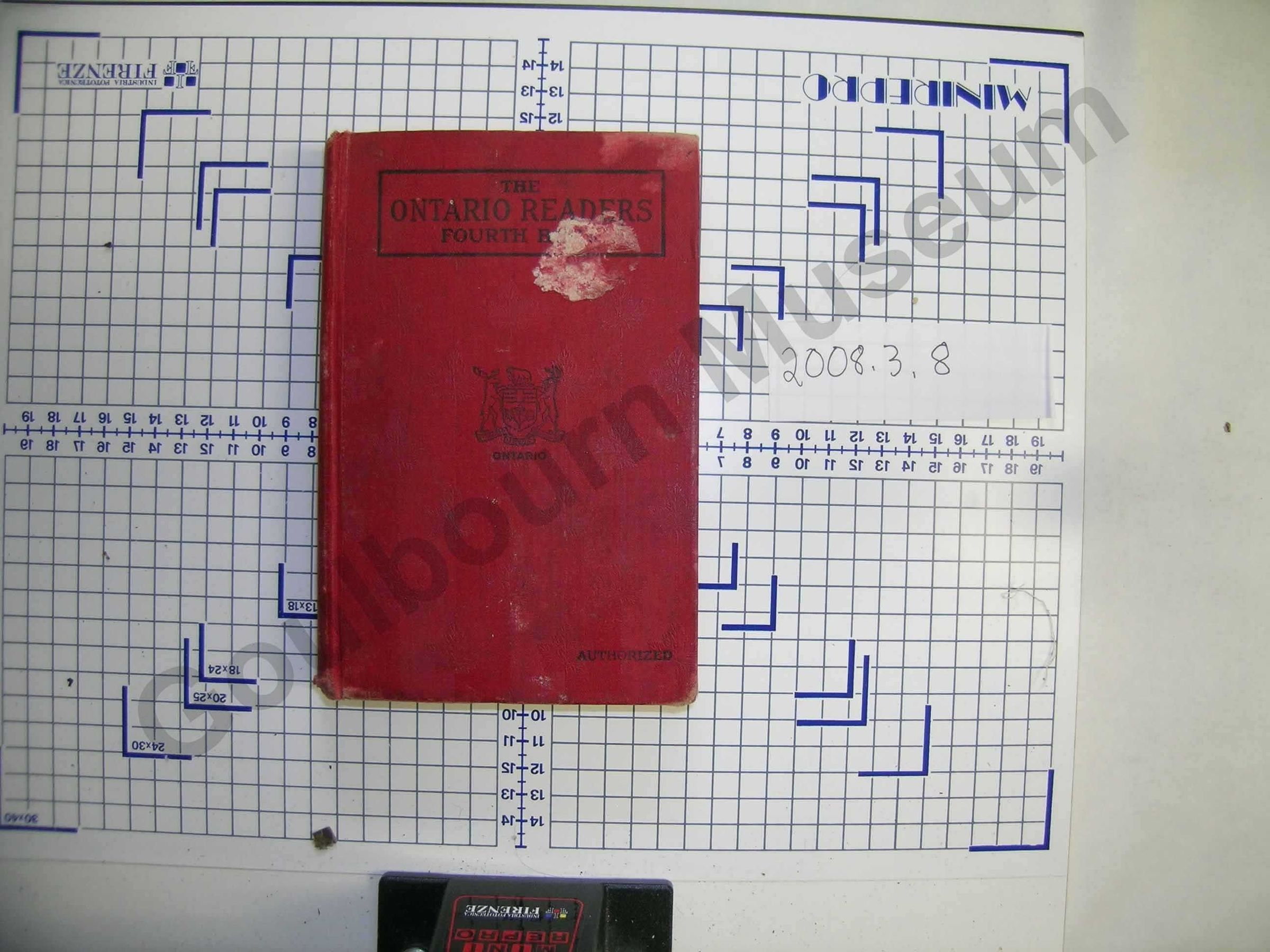 Red book titled in black ink as "The Ontario Readers, Fourth Book" with Ontario's coat of arms.