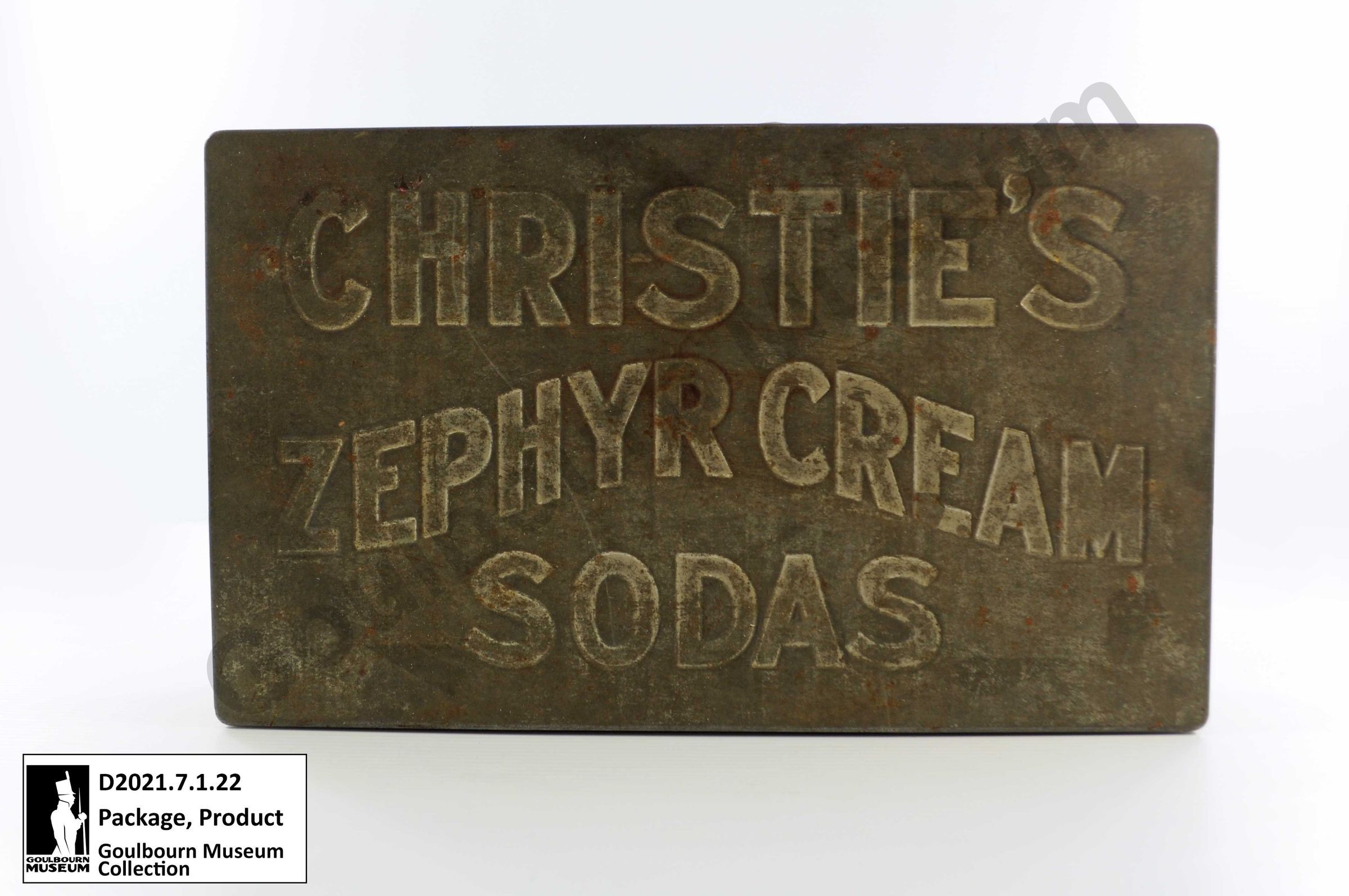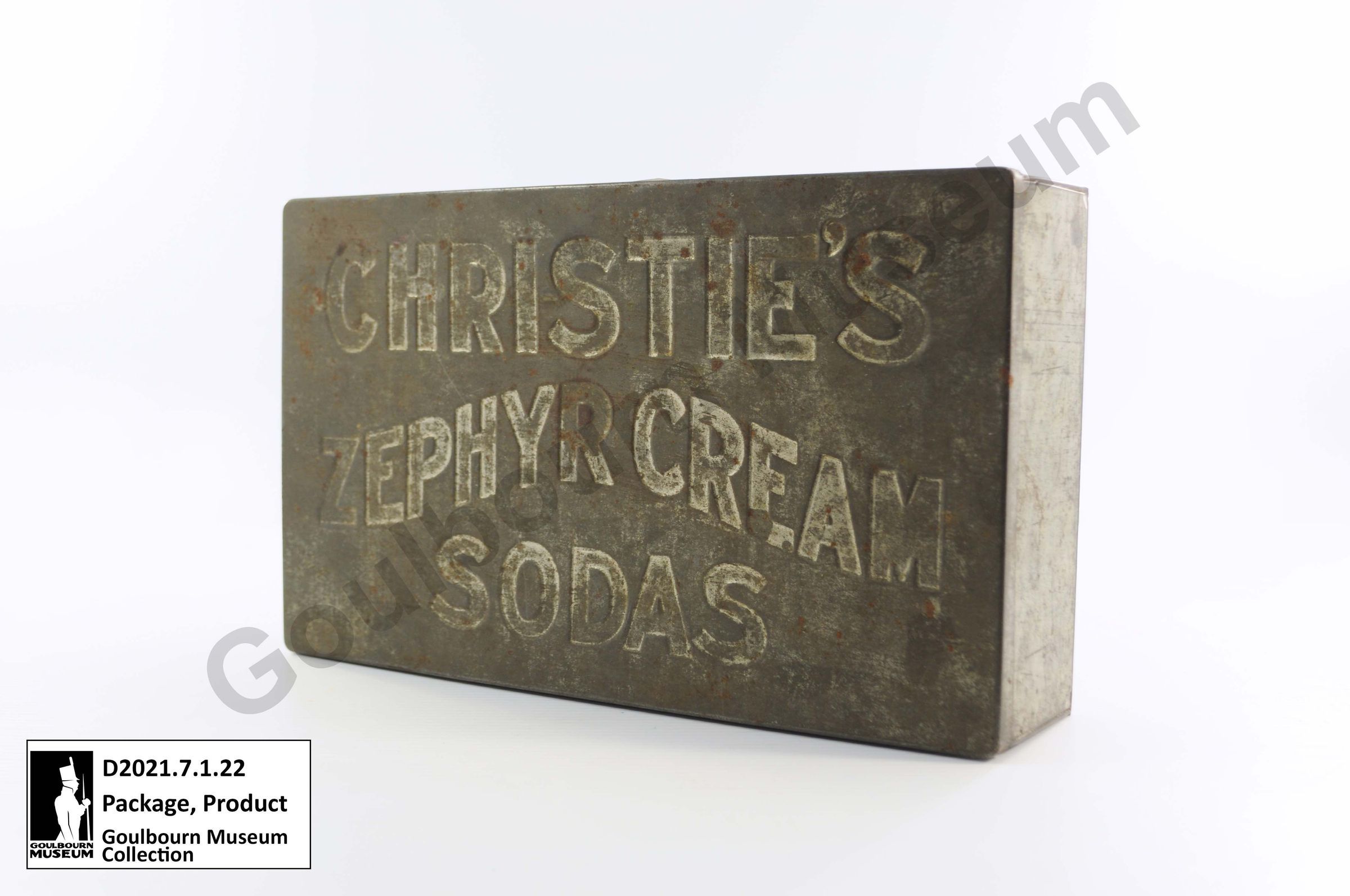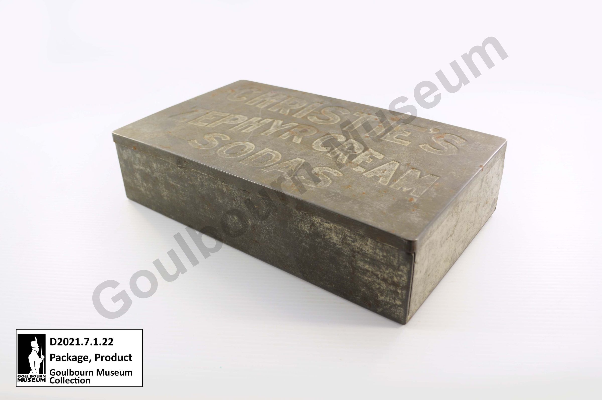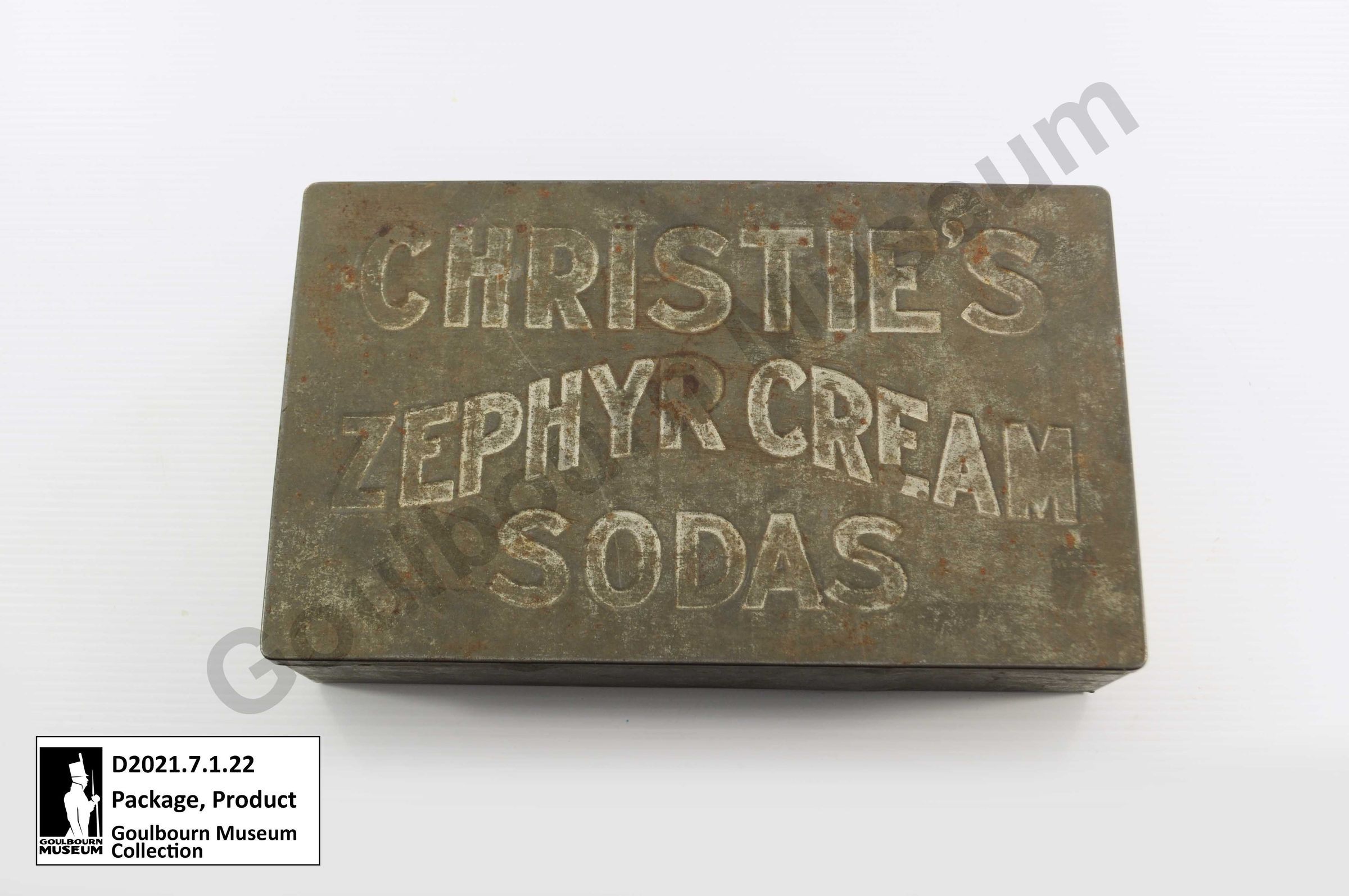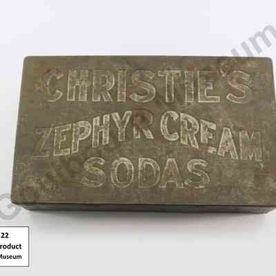 Silver coloured rectangular metal product tin made of sheet metal. Lid has the words CHRISTIE'S ZEPHYR CREAM SODAS imprinted on it.Context