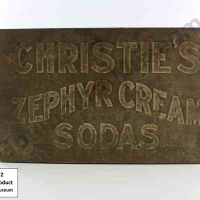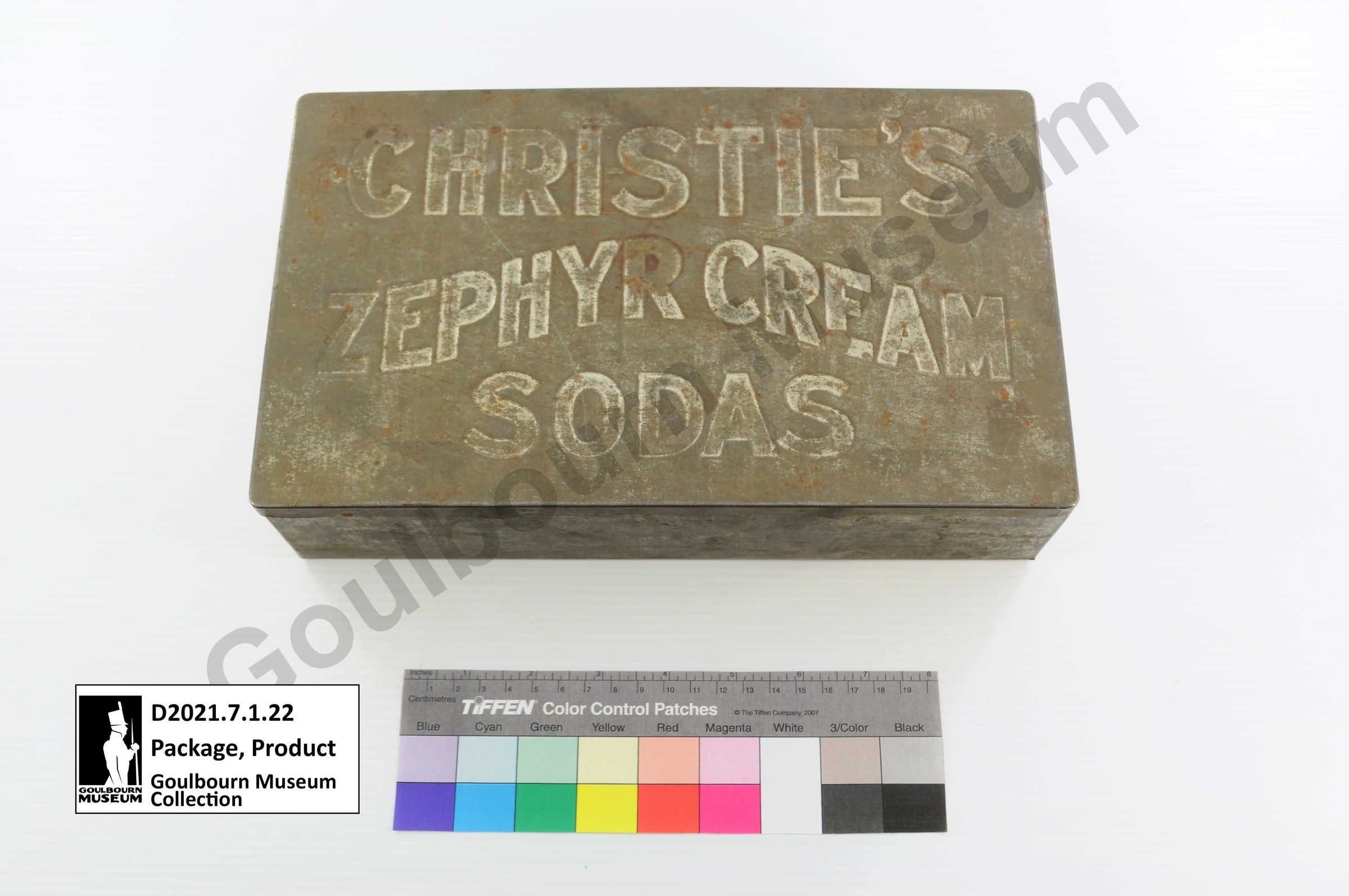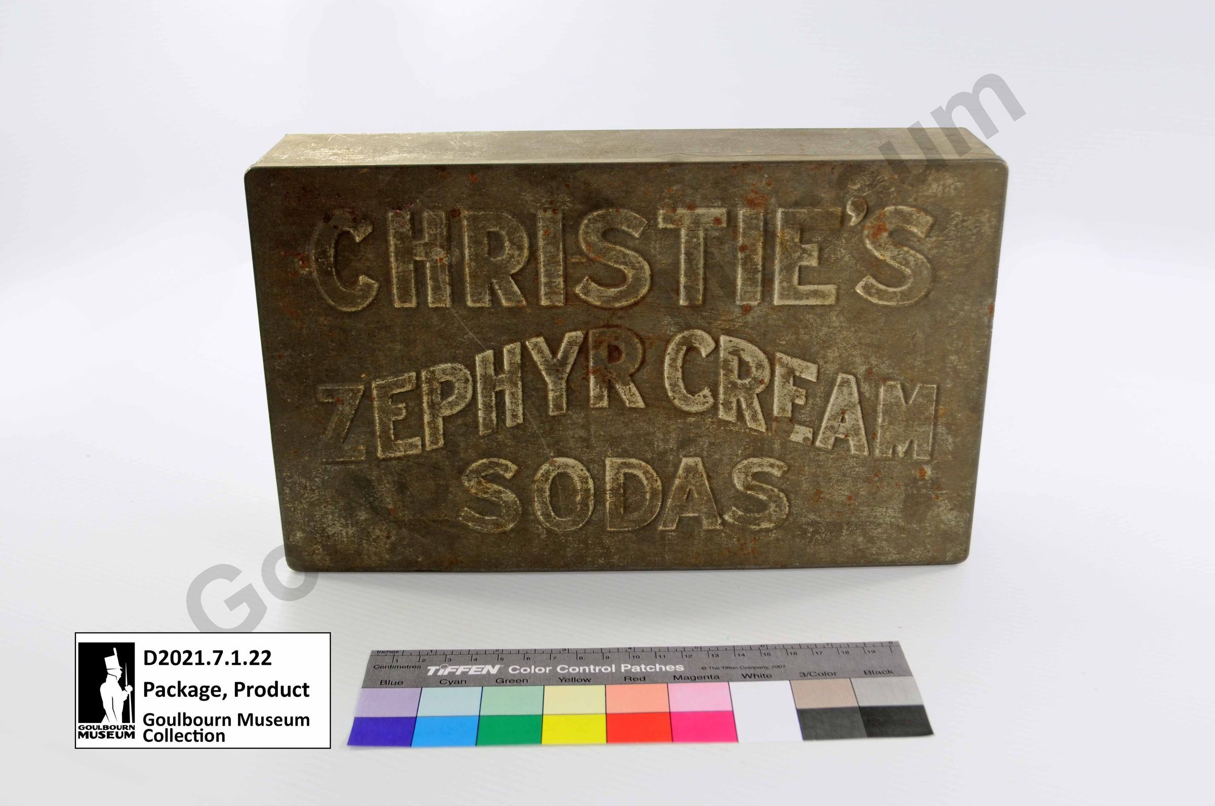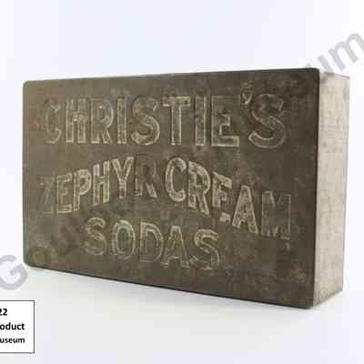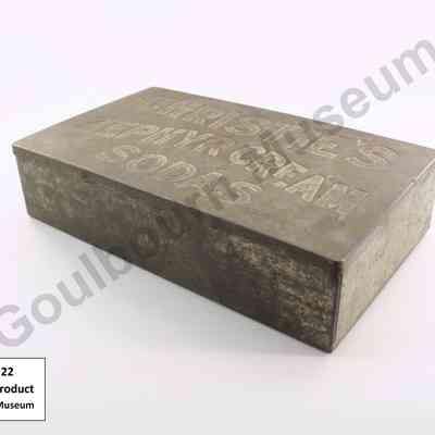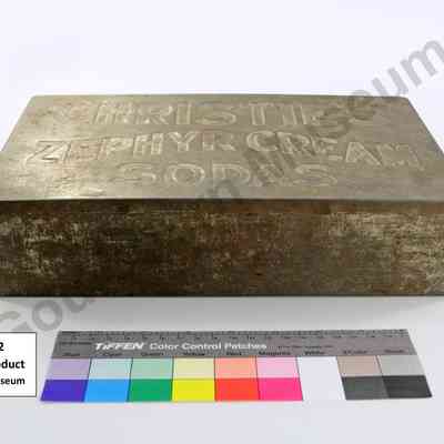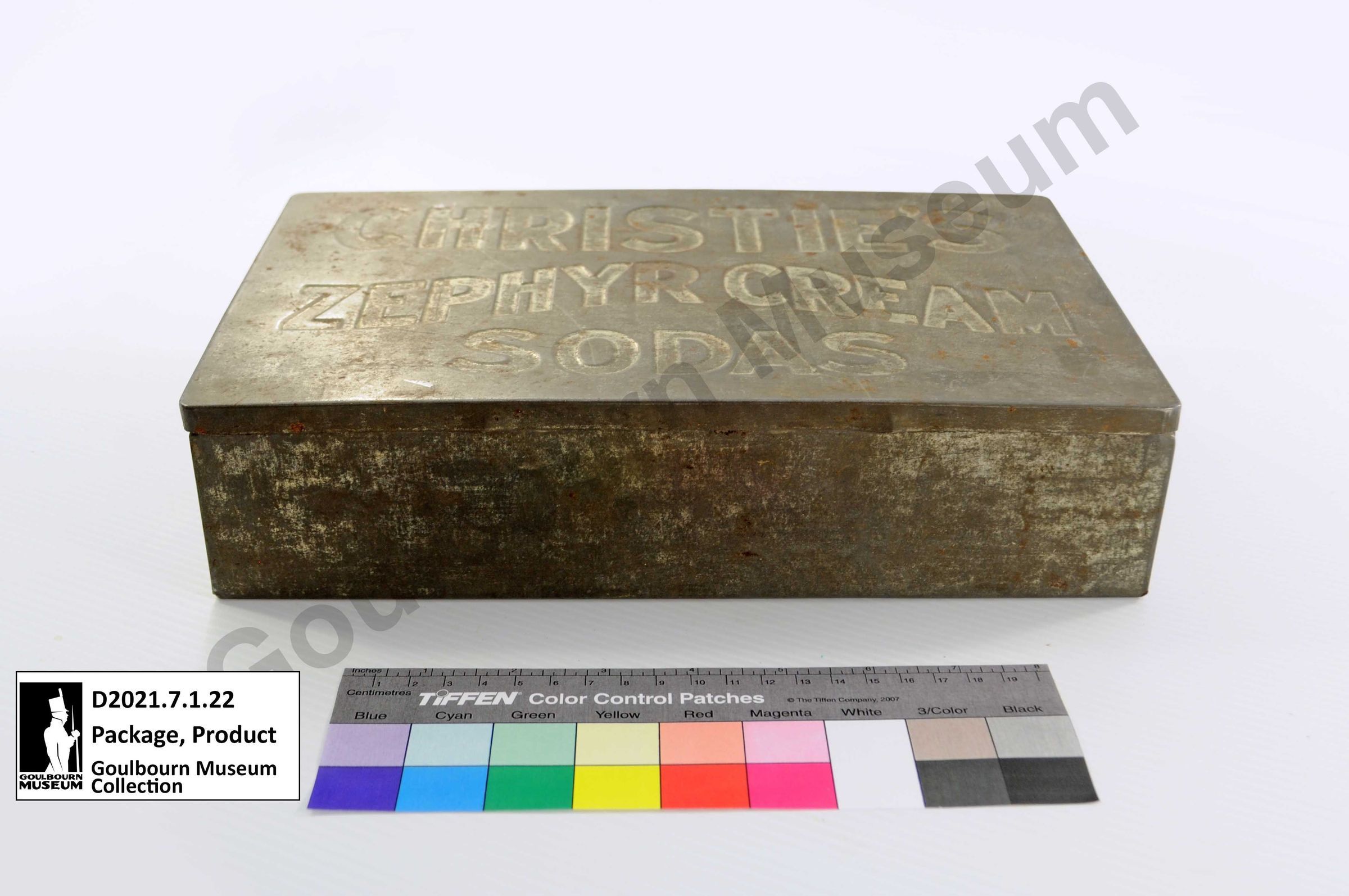 Silver coloured rectangular metal product tin made of sheet metal. Lid has the words CHRISTIE'S ZEPHYR CREAM SODAS imprinted on it.Context