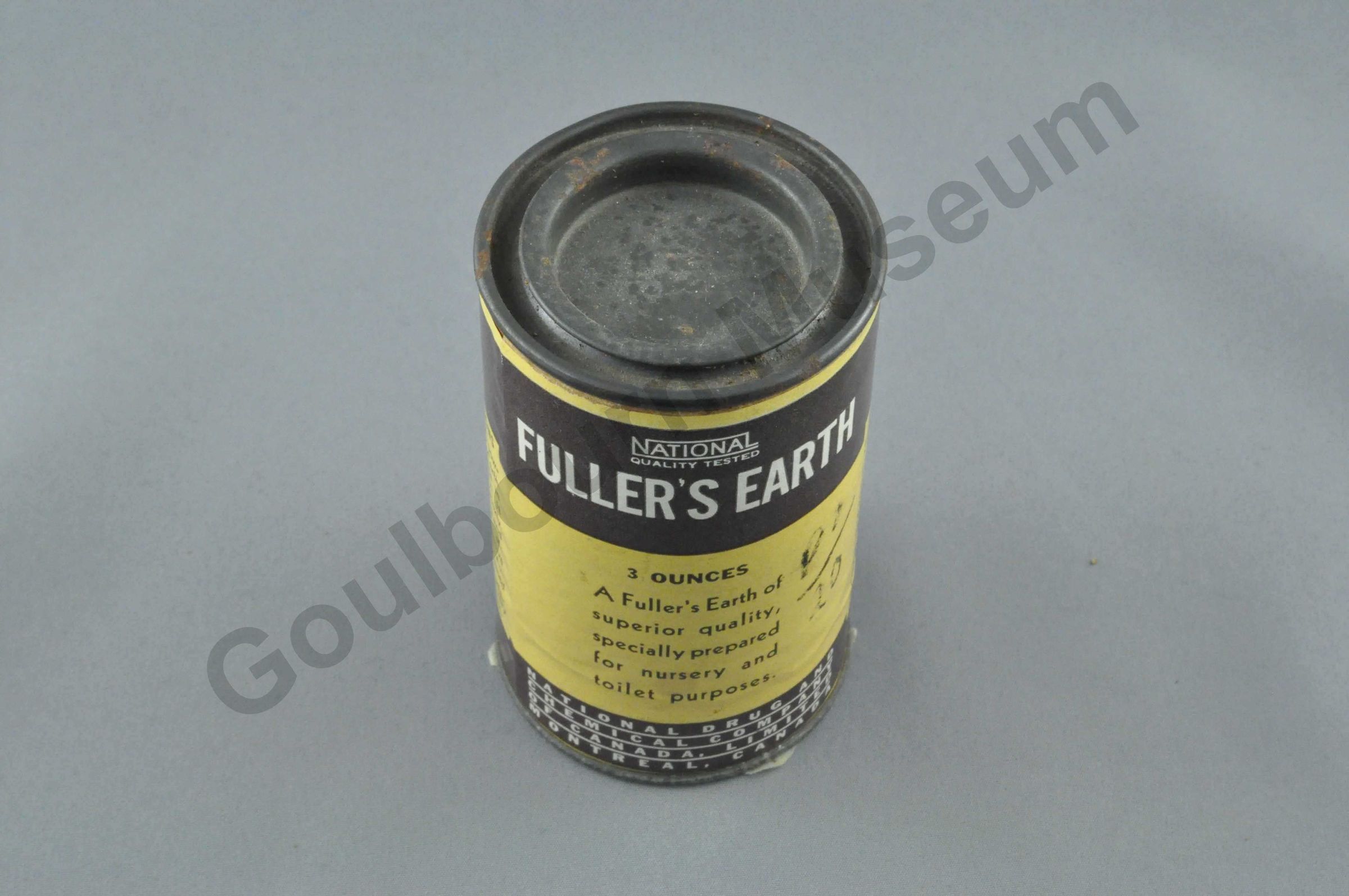 Tin of "Fuller's Earth" powder. Brown & yellow bilingual label reads "A Fuller's Earth of superior quality, specially prepared for nursery and toilet purposes. National drug and chemical company of Canada, limited Montreal, Canada."... "Relieves prickly heat, chafing and unpleasant effects of excessive perspiration..."Lexicon