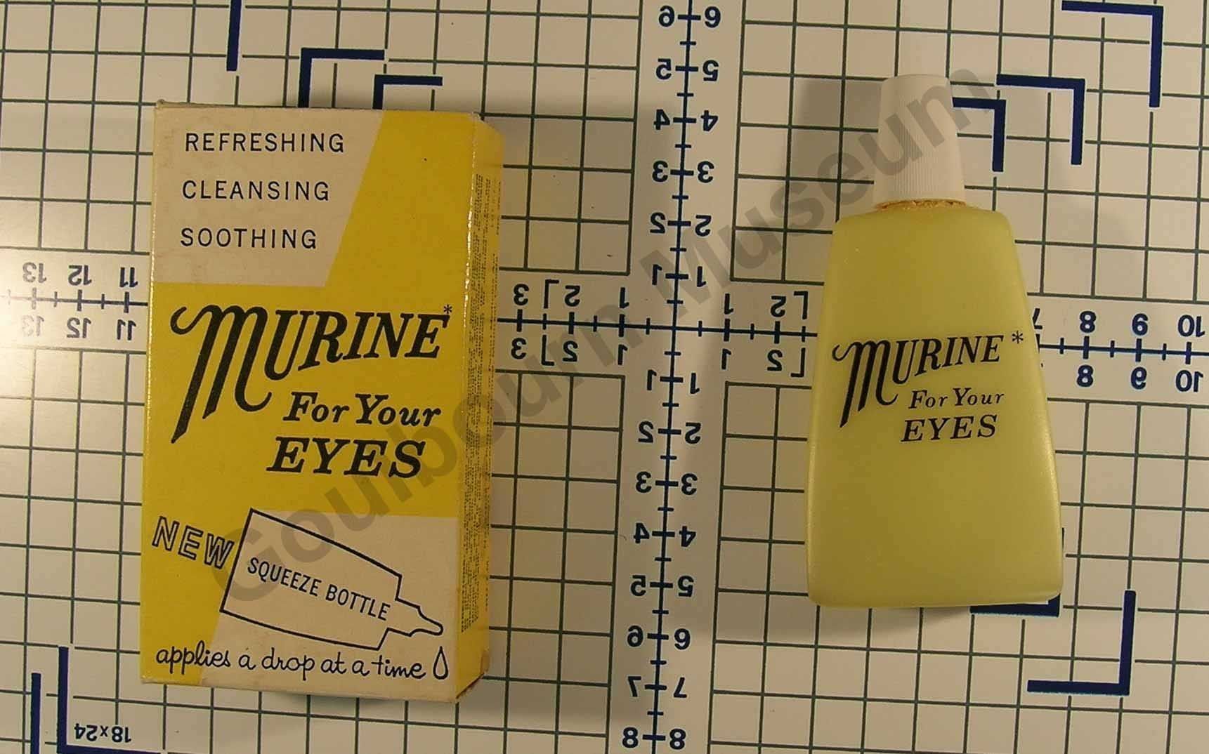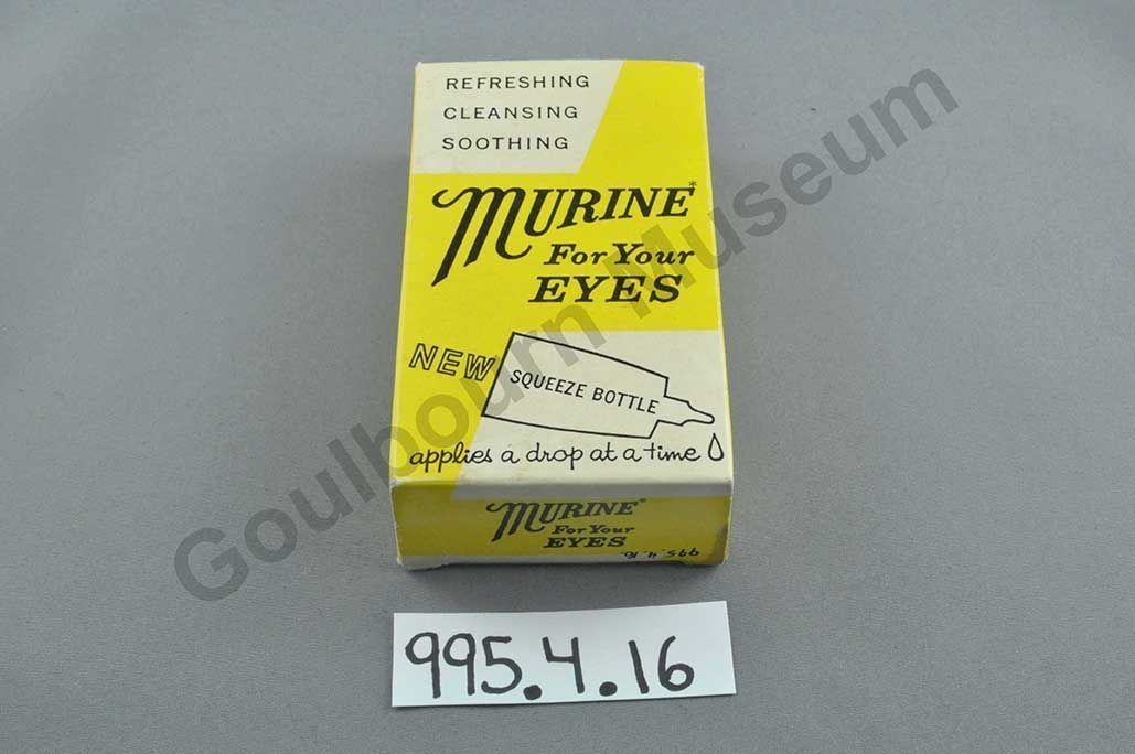 Yellow rectangular box reading "Murine for your Eye. Refreshing, Cleansing, Soothing".Context