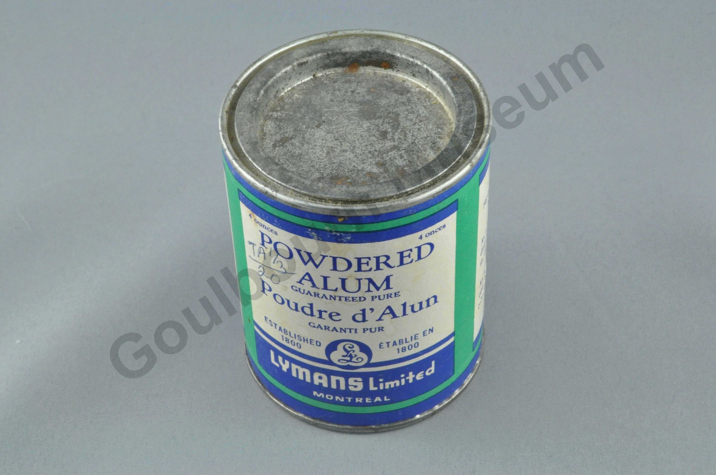 Cylindrical metal canister with paper label. Label reads: "Powdered Alum. Guaranteed Pure. Poudre d'Alun. Garanti Pur. Established 1800. Etablie en 1800. Lymans Limited, Montreal."Context