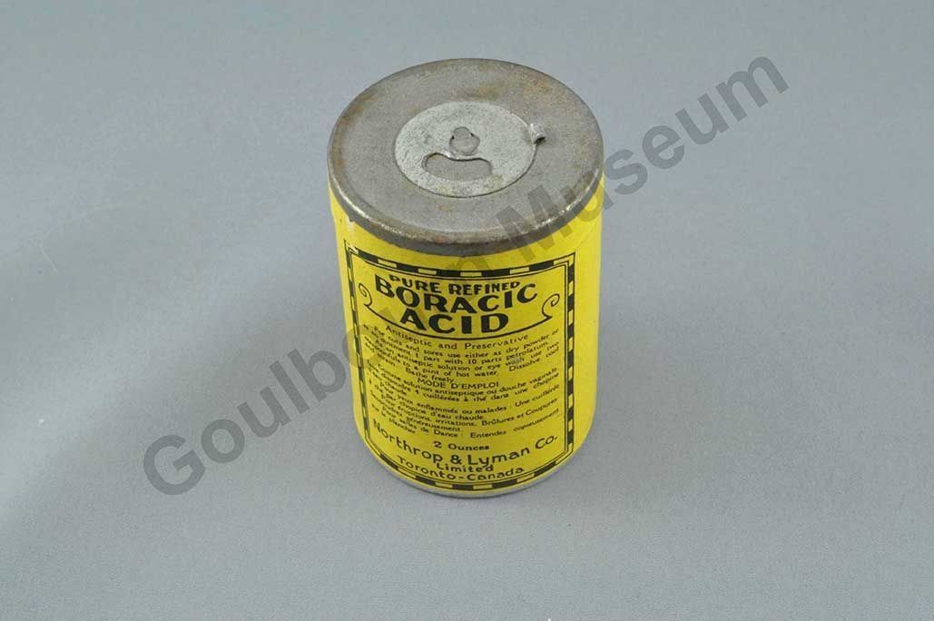 Cylindrical metal canister with yellow label. Text written on label reads: "Pure Refined Boracic Acid. Antiseptic and Preservative. For cuts and sores use either as dry powder or as an ointment: 1 part with 10 parts petrolatum. As an antiseptic solution or eye wash use two teaspoonfuls to a pint of hot water. Dissolve, cool and strain. Bathe freely." Text below provides the French translation. Manufactured by Northrop & Lyman Co., Limited, Toronto Canada.Context
