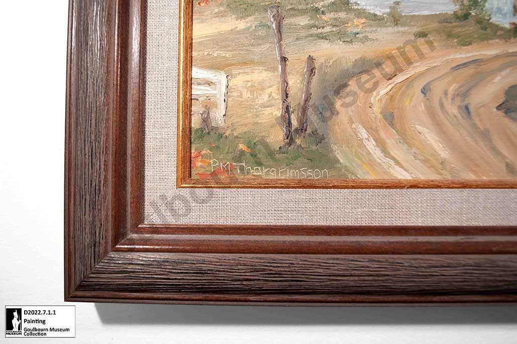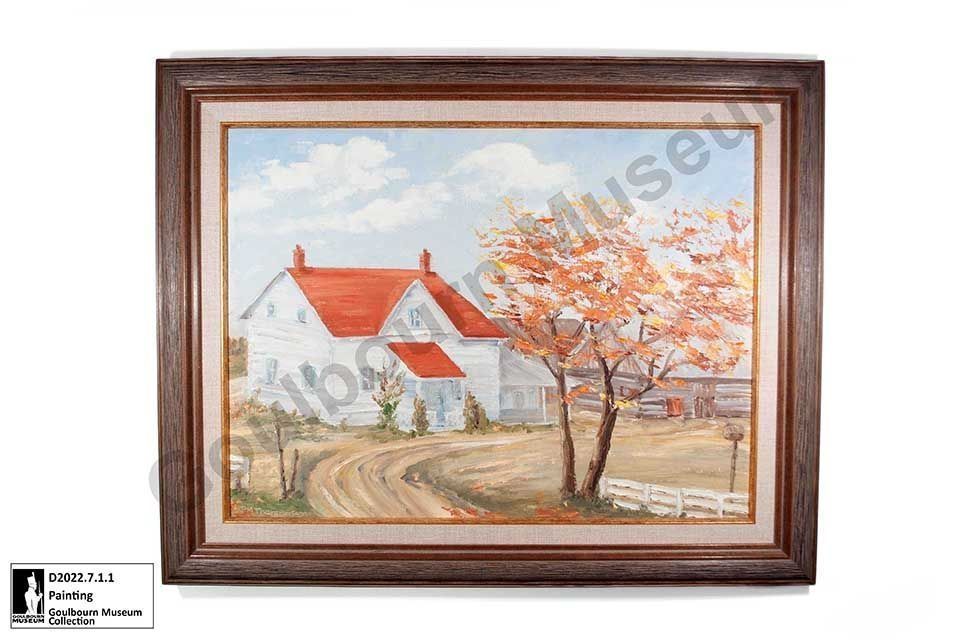 Digital collections asset. Framed oil painting of the Graham farm once located on Mansfield Road. The painting shows the whitewashed log home which is two-stories in height, has a vaulted red-orange coloured roof, a central roof peak framing an upstairs window, and a small covered front porch at the front door. The left side of the house is visible with four symmetrical windows. The right side of the house has a covered porch which included the summer kitchen and gathering area for family. In front of the house is a driveway, white painted fence, and trees depicted with fall foliage. The right side of the scene is partially obscured by tree canopy, in the background is a natural coloured wood dairy barn with a vaulted rood and the roofline of an undisclosed outbuilding is visible behind the dairy barn.Context