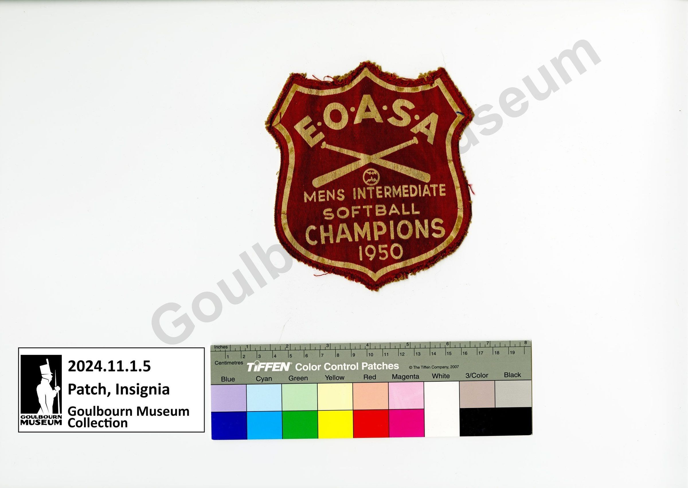 Patch, Insignia: E.O.A.S.A. Mens Intermediate Softball Champions, 1950Entry/Object ID