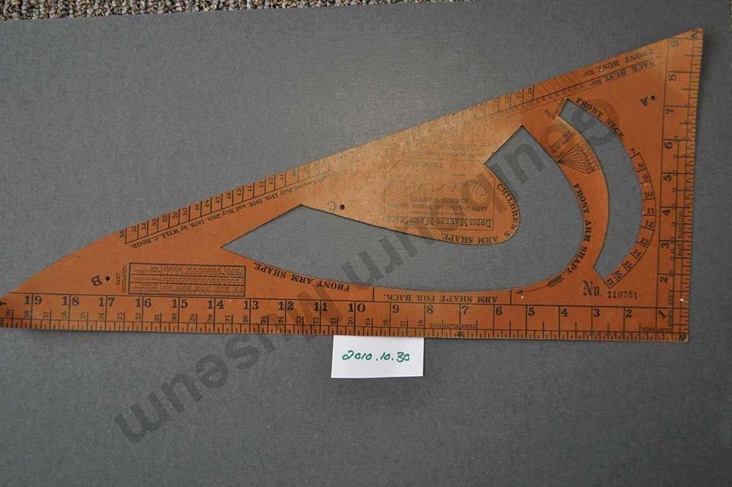 Dressmakers' Magic Scale. Resembles a ruler and was used to cut patterns for clothing; contains cut-outs for creating arms and necks for children's clothing. Text written in black ink reads "Copyright Secured July 15th, 1878, and May 28th, 1879, by Will C. Rood."Collection