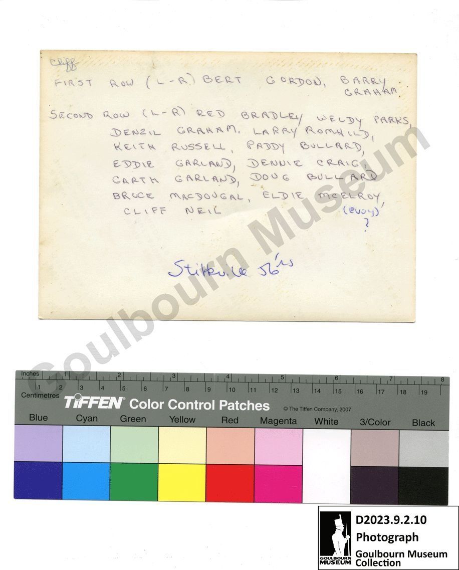 SECOND ROW (L-R) RED BRADLEY, WELDY PARKS, DENZIL GRAHAM, LARRY ROMHILD, KEITH RUSSELL, PADDY BULLARD, EDDIE GARLAND, DENNIE CRAIG, GARTH GARLAND, DOUG BULLARD, BRUCE MACDOUGAL, ELDIE MCELROY (evoy?), CLIFF NEIL