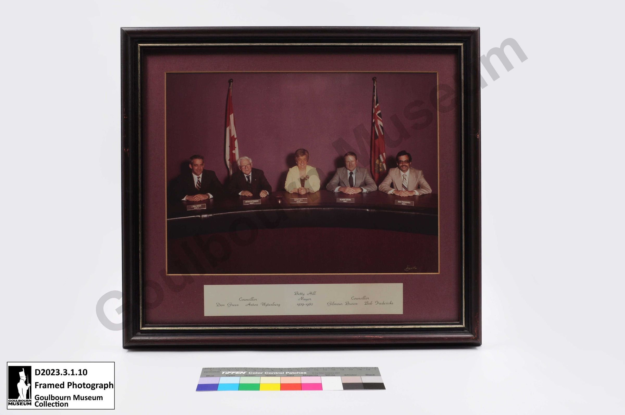 This item has a brown wooden frame with a gold accent, burgundy mat board displaying a photograph which depicts five individuals sitting at a dark wooden desk with small wooden name plates in front of each individual. At the bottom edge of the mat board is a silver rectangular name plate that has cursive font of the individuals names and the year 1979-1980. The photograph shows five individuals, councillors, sitting from left to right; J. Don Green of Ward 3, Anthony Wytenburg of Ward 4, Mayor Betty Hill, Gilmour Brown of Ward 1, and Bob Fredericks of Ward 2. Two national flags are in the background of the photograph. In the bottom right corner of the photograph is a golden signature, Dixie. The back of the frame is covered in a brown paper. At the top of the frame is a piece of tape with the number four written in black ink. Along the sides are screws that connect a thin metal wire across the frame. In the middle where the metal wire crosses horizontally, is a hole in the brown paper backing. In the bottom corners of the frame are small plastic blockers to prevent damage to the wall or frame when hung on a surface.Context