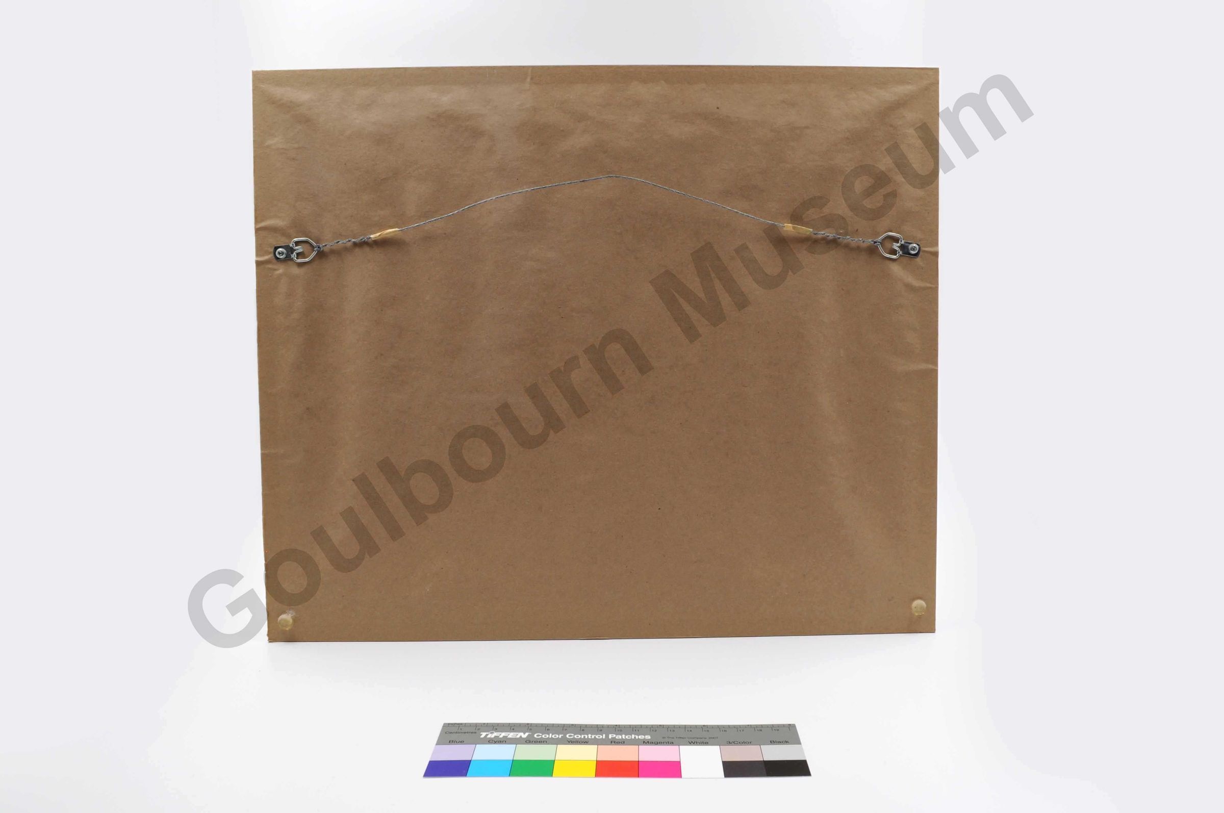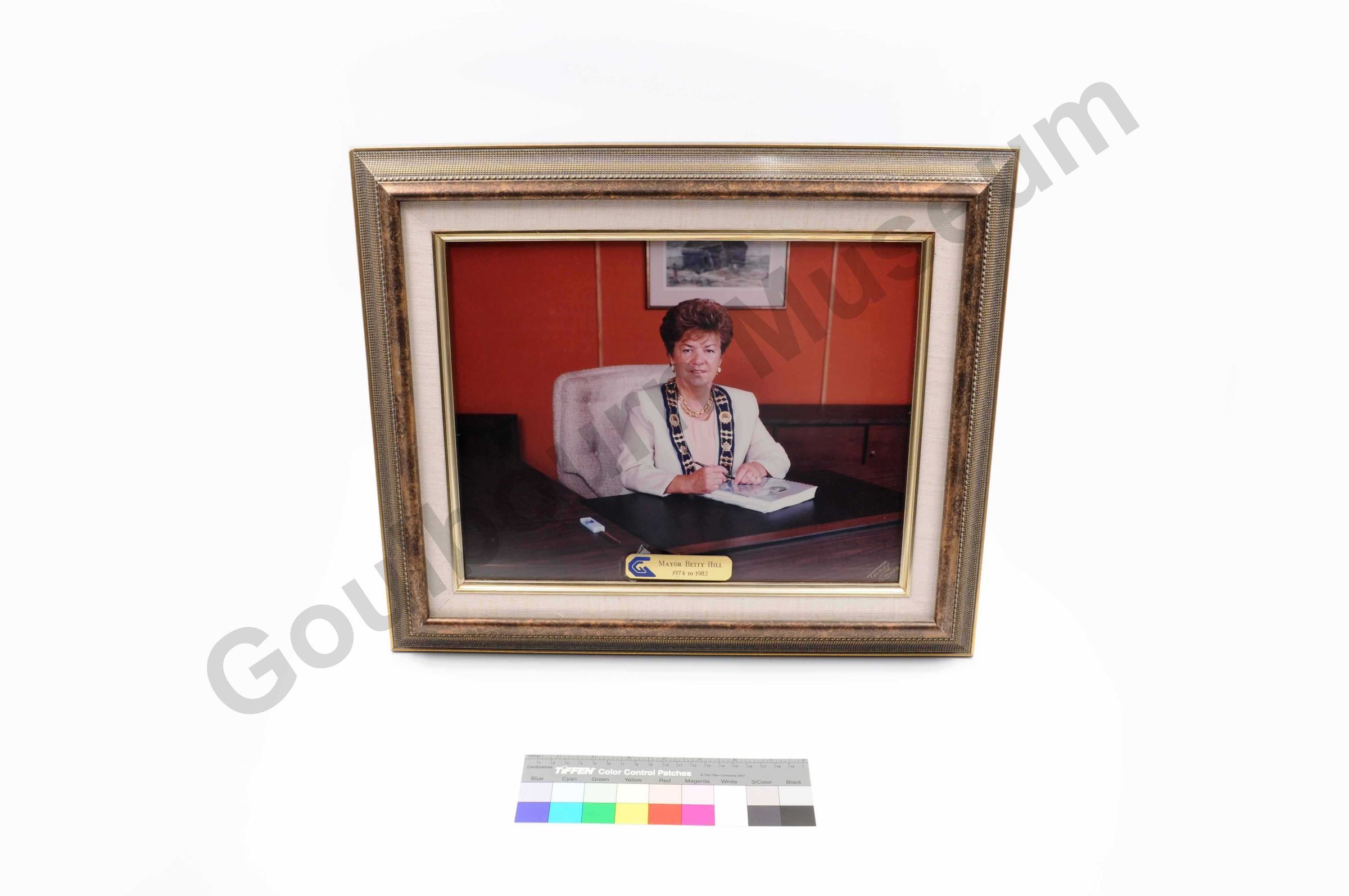 This item is a rectangular brown/bronze coloured photograph frame which contains one colour photograph of the Mayor of Goulbourn Township during the years 1974-1982. Mayor Hill is sitting at a large dark brown desk with a pen in her right hand and a document under her hands. At the bottom edge of the photograph is a metal name plate with the large blue letter G insignia representing Goulbourn Township. Next to this, etched, is the name Mayor Betty Hill and the term 1974 to 1982. In the bottom right corner of the photograph is a gold coloured signature, Toomey Ottawa. The reversed side of the frame is covered in brown paper. On the sides of the frame are screws that hold a piece of metal wire used for hanging the frame. In the bottom corners have plastic buffers.Context
