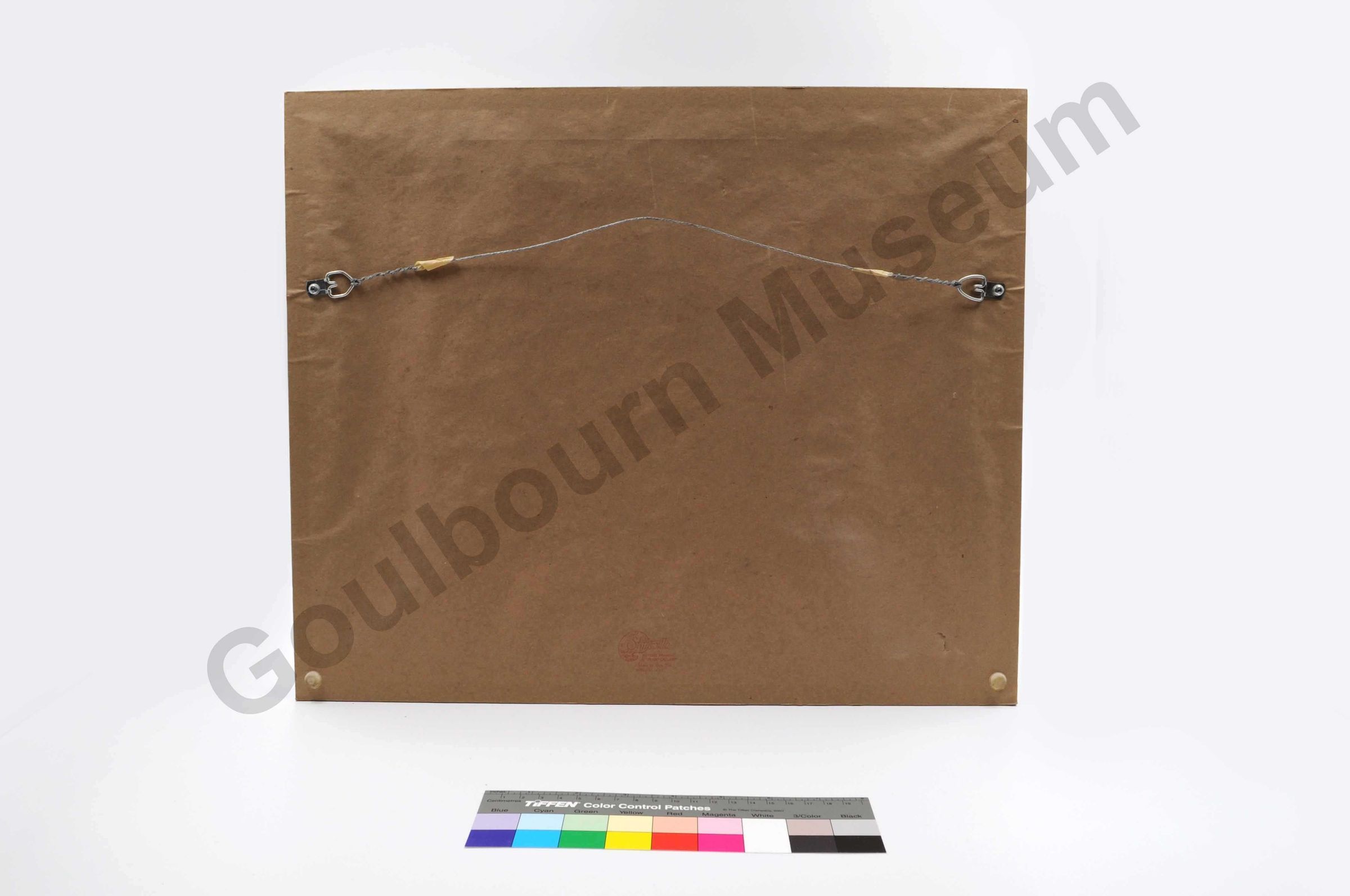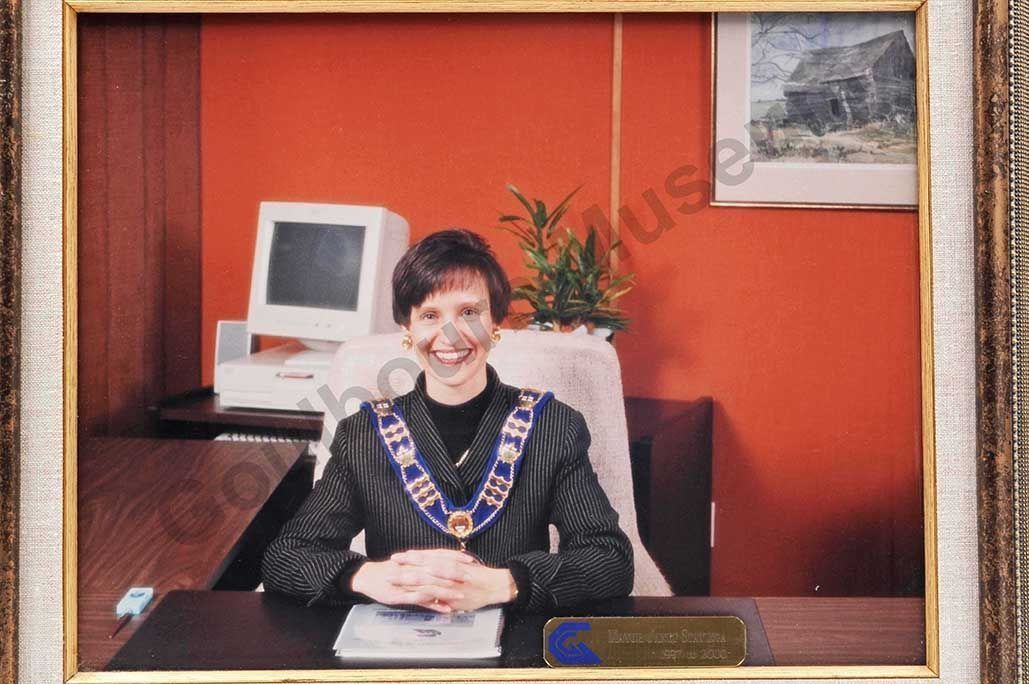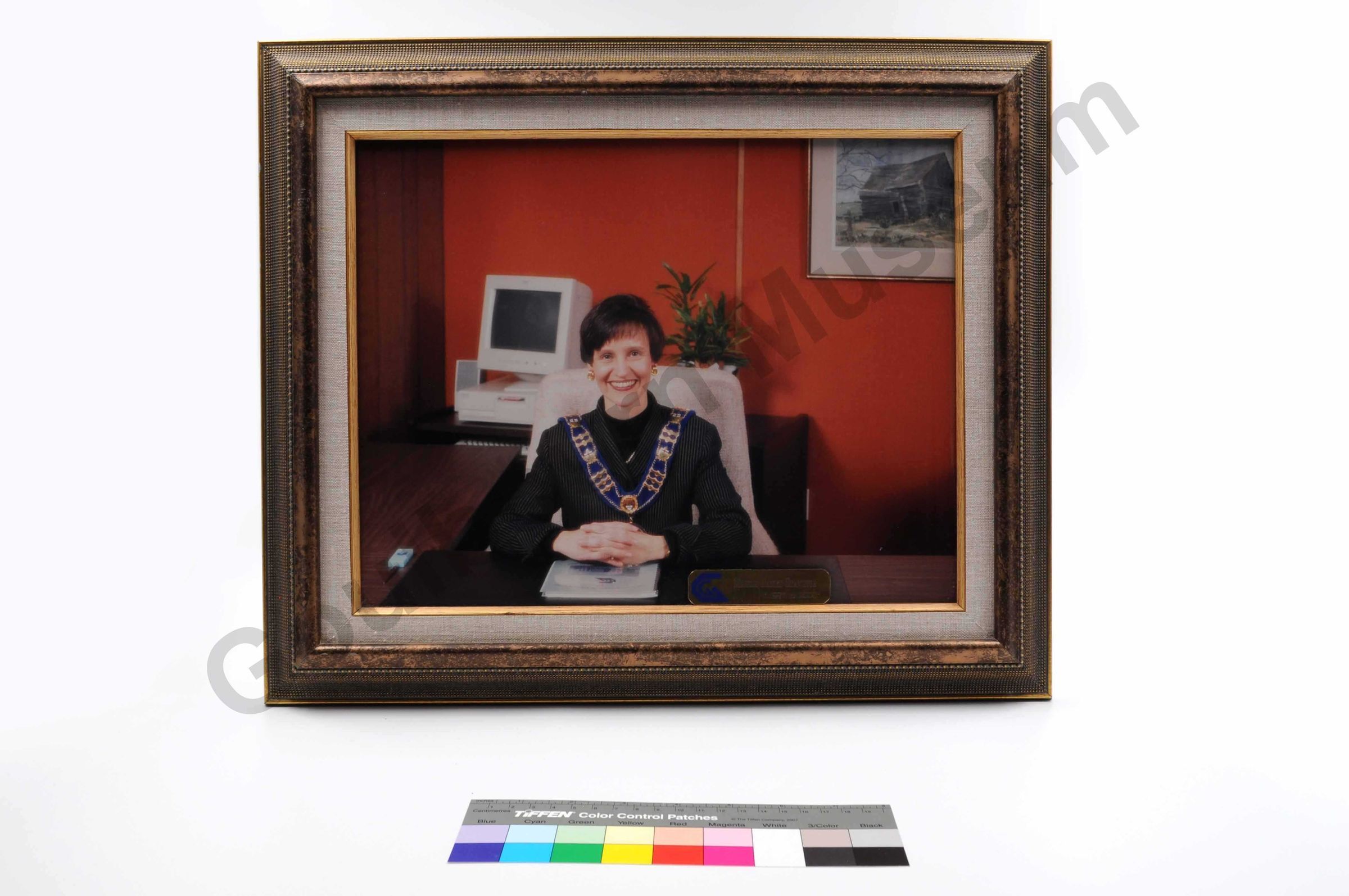 This item is a rectangular brown/bronze coloured photograph frame containing one colour photograph of a Goulbourn Township Mayor during the term 1997-2000. Mayor Stavinga is sitting at a large dark brown desk with her hands clasped together while resting over some documents. Behind her against the orange coloured wall is a computer monitor and next to it a green plant. Along the bottom of the photograph is a metal name plate with a capital blue letter G insignia representing Goulbourn Township. Next to this, engraved in the plate is the name Mayor Janet Stavinga and the term length 1997-2000. On the reversed side of the frame is a brown paper backing. On both sides of the frame are screws that hold the thin metal wire used to hang the frame. At the bottom corners of the item are plastic buffers.Context