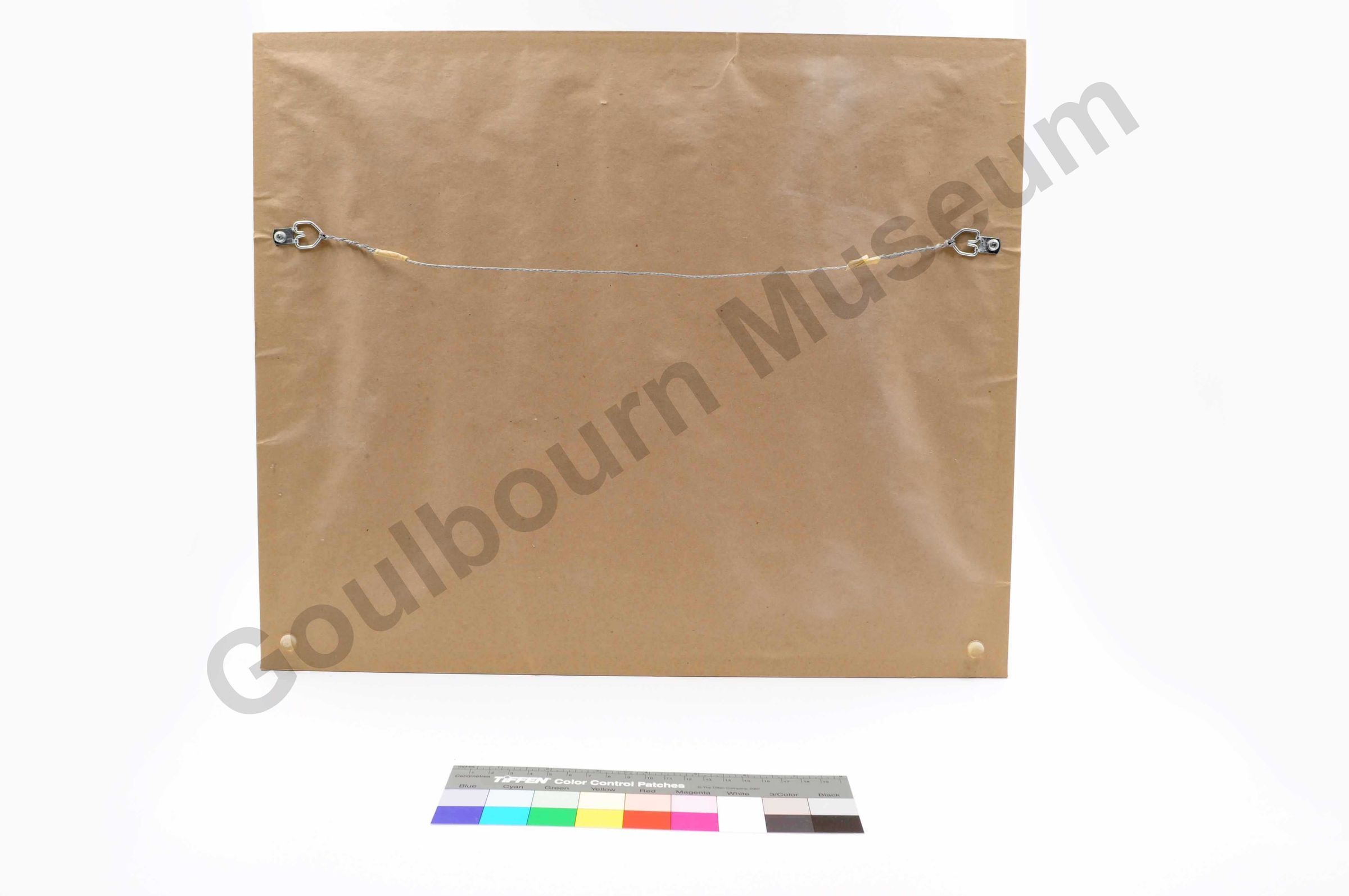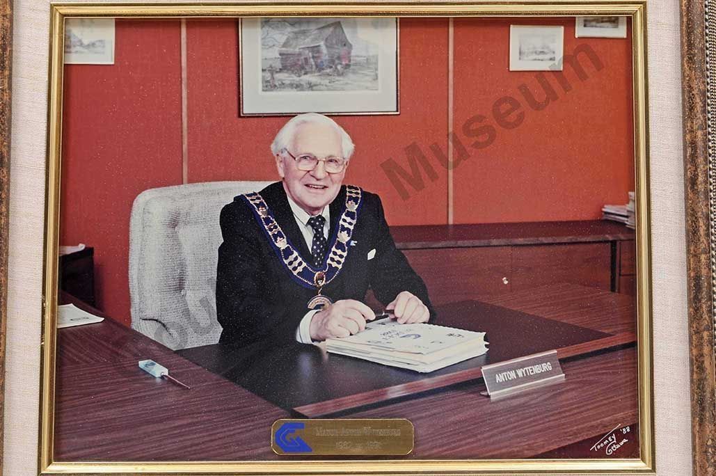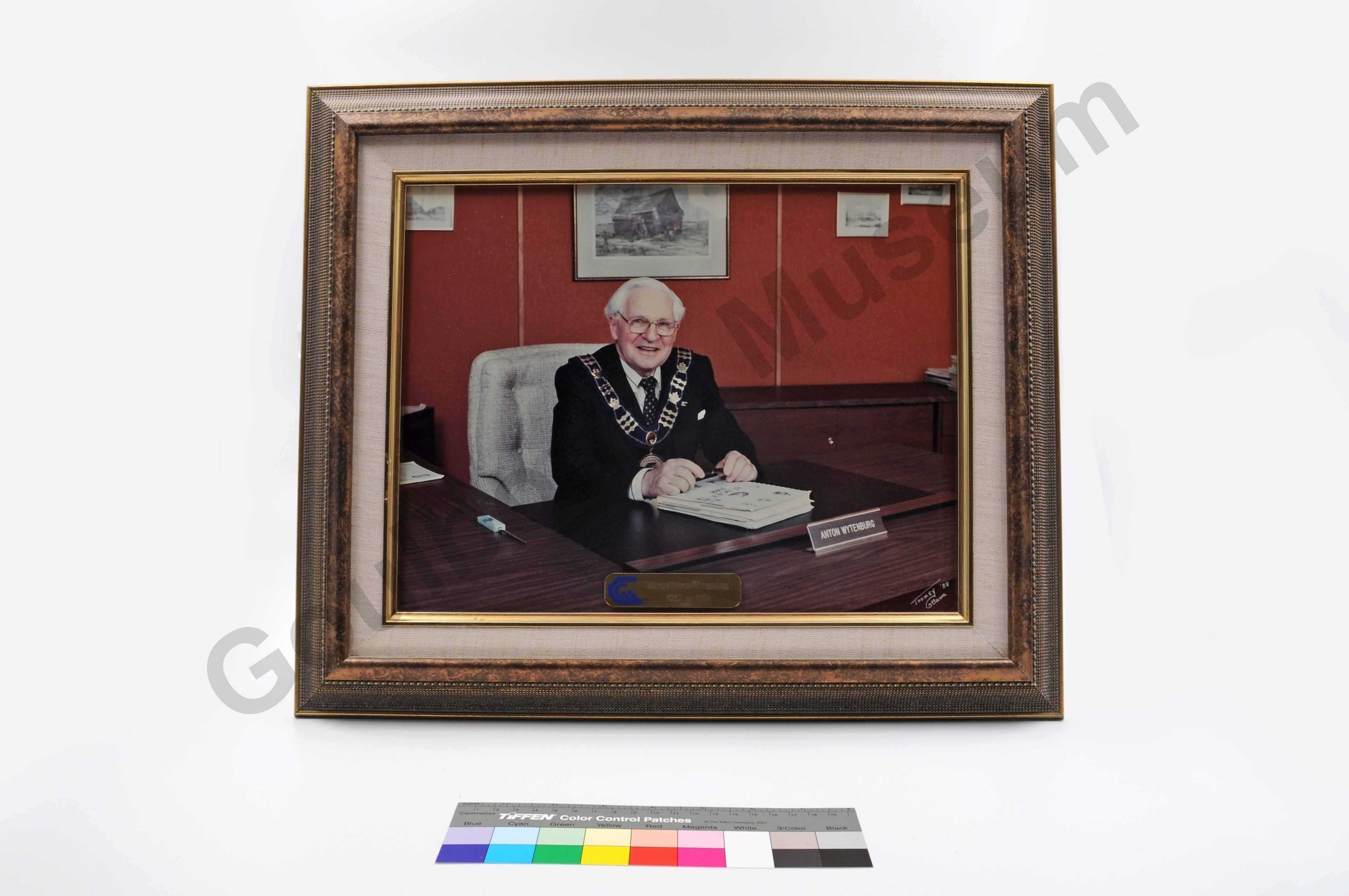 This item is a rectangular brown/bronze coloured photograph frame that contains one colour photograph of the Goulbourn Township Mayor Wytenburg during the term 1982-1991. The photograph shows Mayor Wytenburg sitting at a large dark brown desk, holding a pen with both hands while rested on a collection of documents. A desk name plate is placed in front of the of documents with white text reading Anton Wytenburg. At the bottom edge of the photograph is a metal name plate with a large capital blue letter G as the insignia for Goulbourn Township. Next to this, engraved in the plate is the name Mayor Anton Wytenburg and the term length 1982-1991. In the bottom right corner of the photograph in white coloured ink is a signature reading "Toomey 88 Ottawa". The reversed side of the frame is covered in a brown paper backing. On both sides of the frame are screws that hold a thin metal wire for hanging the frame. In the bottom corners of the item are two plastic buffers.Context