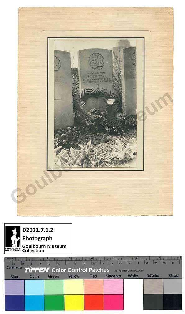 A black and white photograph taken at a cemetery with headstones of Canadian First World War soldiers. Central in a row of headstones is that of Sefton Stewart who was a resident of Richmond, Ontario. The headstone is a rectangular shape with a rounded top edge. The top of the stone is decorated with a maple leaf carved in relief and bordered by a circle. The headstone is engraved with text that reads, "145820 PRIVATE / S. I. STEWART / 13TH BN. CANADIAN INF./ 8th AUGUST 1918 AGE 20." On the ground in front of the stone is a wreath of leaves with flowers attached to the bottom centre and a tag with undistinguishable text. In the background there is a large stone monument on the right side. The photograph is adhered to a cream coloured card backing.Photograph Details