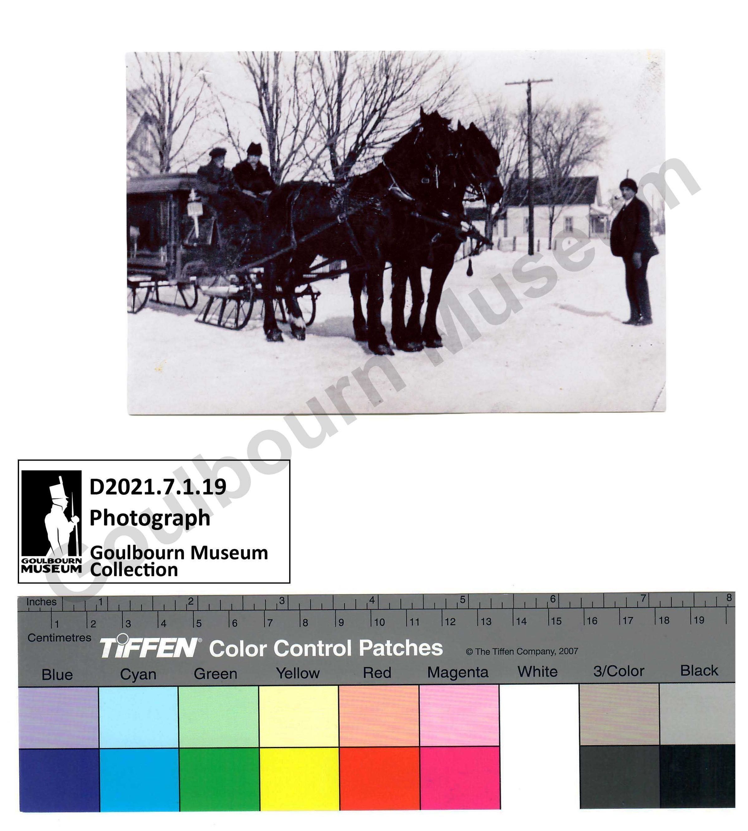 One black and white photograph of three male figures, two seated on a horse drawn funeral hearse, and one man standing at the front of the team of horses. One of the drivers is presumed to be James Stewart who was an undertaker by profession. The donor identified the man standing on the road as George Stewart. The photograph was taken in the winter with snow covering the ground, and the horse drawn hearse using sleigh skis. The three men are dressed in winter clothes with dark coloured long jackets and winter hats. The hearse is pulled by two black horses and there is a street scene in the background with one white frame house visible on the right side of the photo. The male figure on the road has a tobacco pipe held in his mouth.
