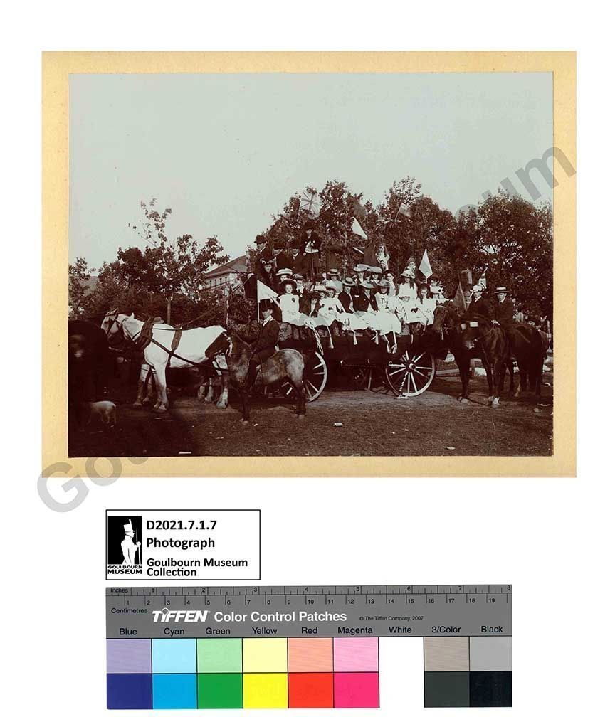 Black and white photograph in sepia tone showing a team of white horses hitched to a wagon centered in the photo. The wagon is driven by one male who is dressed in a dark coloured suit, dark hat and is holding the reins in one hand and a whip in the other hand. The wagon is carrying approximately 25 others ranging from adult to young child in age. The wagon appears to be decorated in draped fabrics and some of the riders are waving flags, which look like the Union Flag, Ontario Flag and plain coloured flags. There are three men on horses surrounding the wagon, the man on the left is wearing a suit and top hat and is riding a shorter horse that is a mottled colour. There are two tall dark coloured horses located at the right of the photograph and rear of the wagon with male riders. Both male riders are wearing a suit jacket, collared shirt and boater style hats. The photograph is mounted to a card backing with an inscription on the reverse that reads, "James Stewart Team Winner at RICHMOND Fair - approx 1904 -5." Donor identified young female rider on bottom row and left most seated position as "Clissie" also known as Clystal Stewart.Context