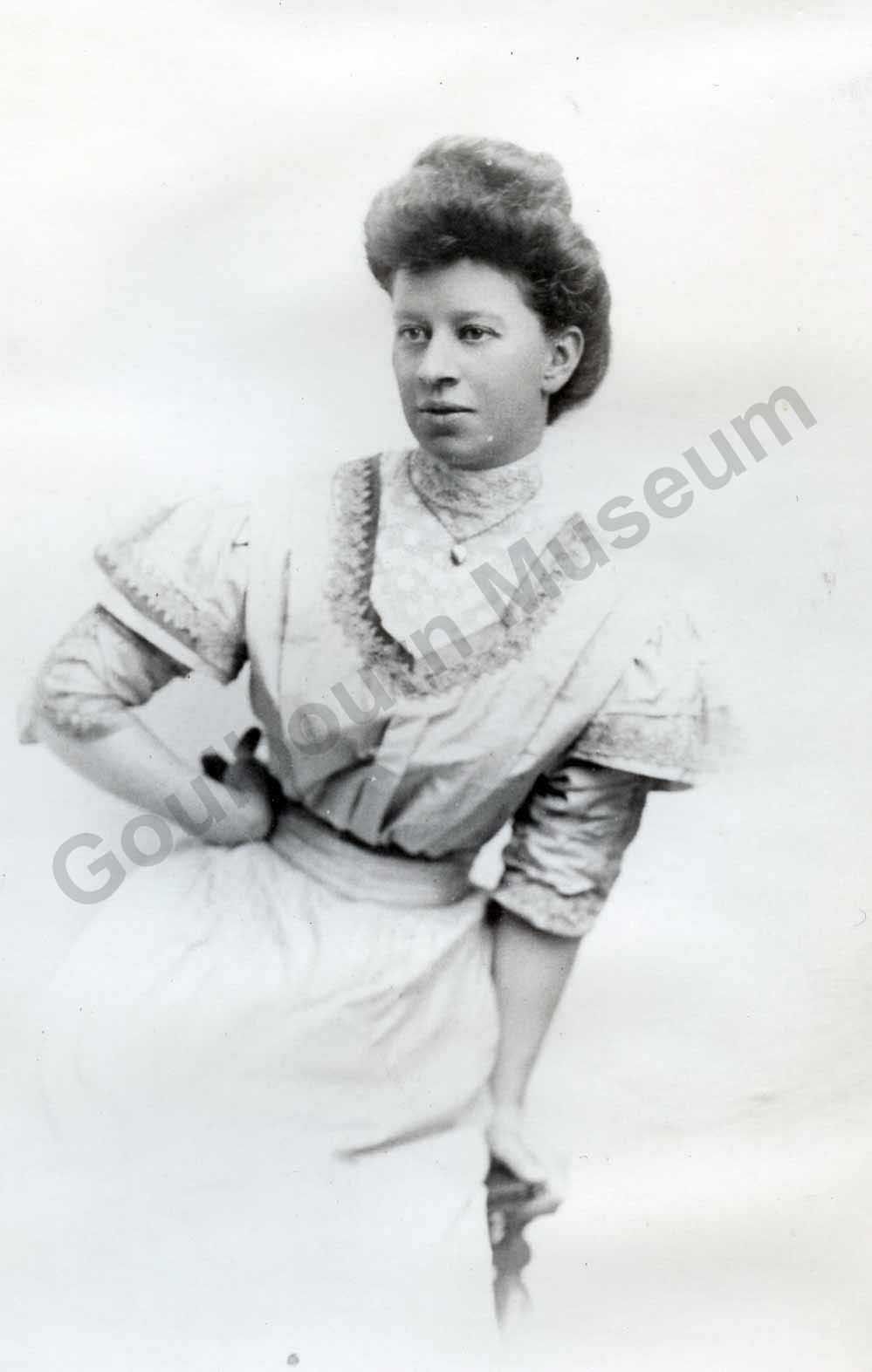 Jenny is wearing the blue dress, also in the museum. JennyMcKenzie McConechy was born in Union, Ont. (near London) in 1882, died inStittsville in 1951. She & her husband (Gordon McConechy) came toSTittsville in 1946 to be near their daughter and son-in-law (Kathleen & Hector Garvie). Mr & Mrs. McConechy built the house at 1582 Main St. in 1947.The builder was Orville Parks who also built the stone house next door forW.J. Bell.Lexicon