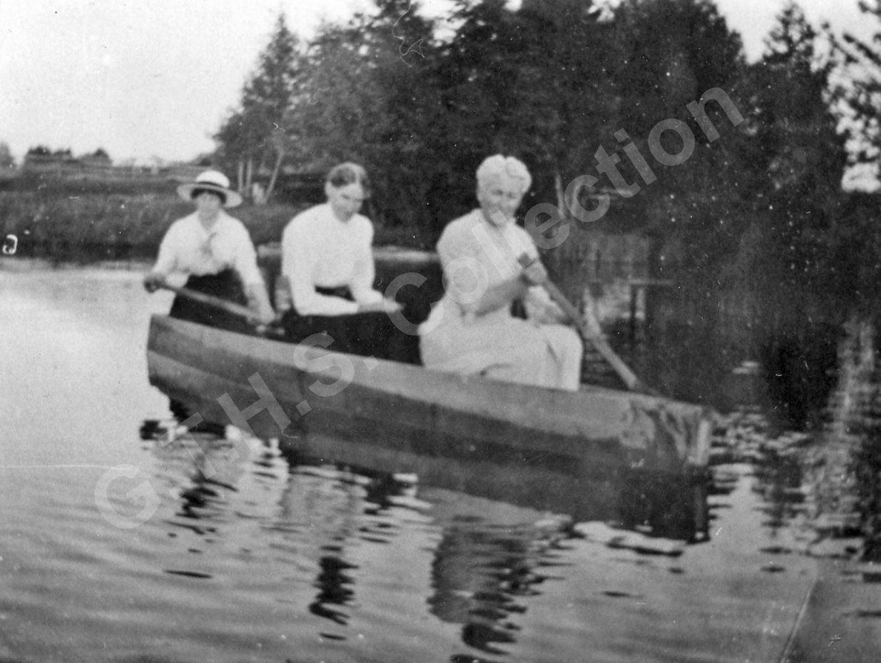 Subject to check, these ladies from Ashton are believed to be (right to left) Emma Hamilton, Mrs Savage and Tina McEwen. These ladies are paddling in a canoe on the Jock River and were school teachers.Photograph Details