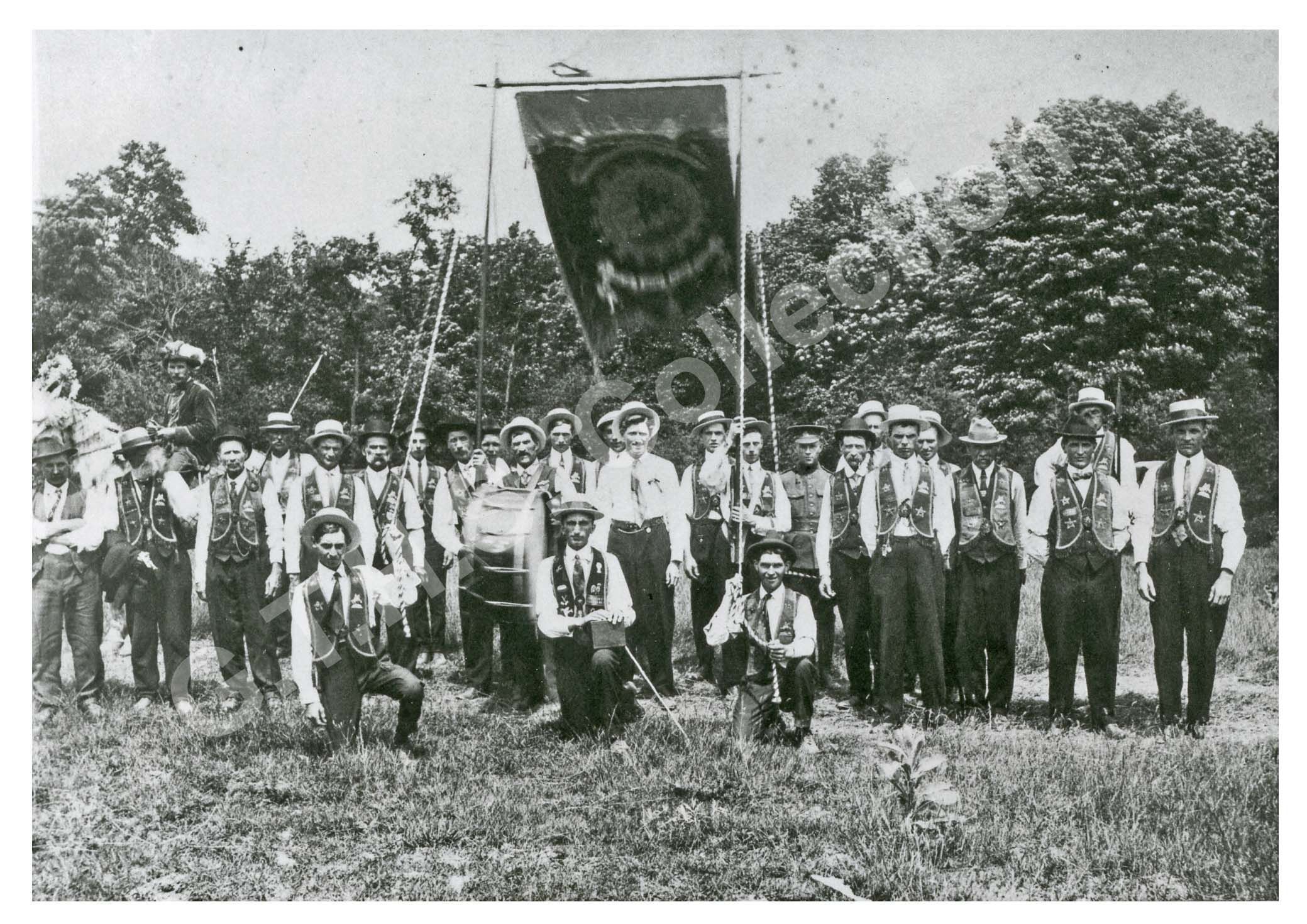 The image shows a group of men from the Loyal Orange Lodge (L.O.L.) No. 54 Ashton gathered outdoors in a grassy area, all wearing matching attire with vests and hats, some holding musical instruments like a drum, and standing or sitting in front of a large banner, against a backdrop of trees, creating an organized assembly, likely for a lodge event or parade.