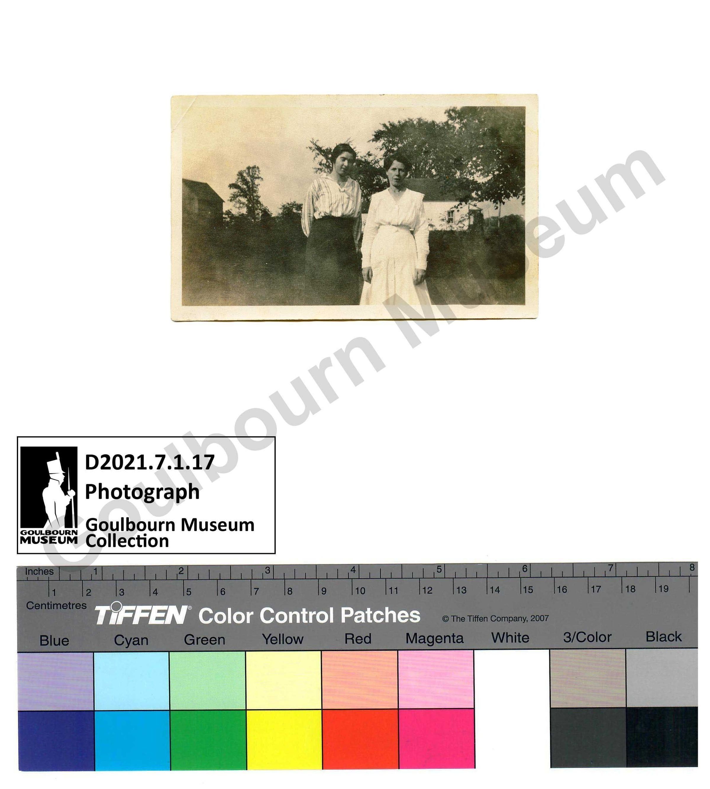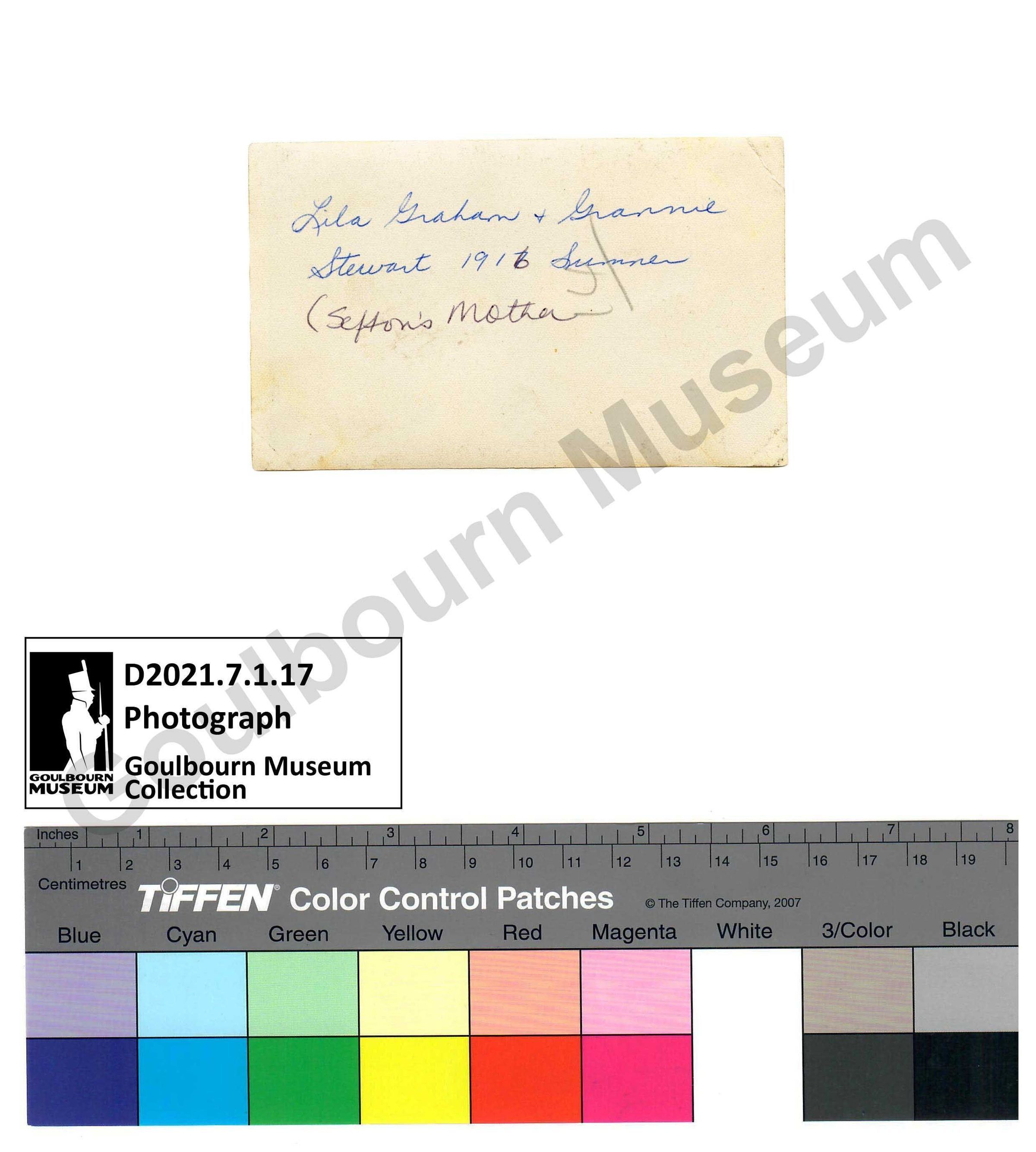 One black and white studio photograph of two Caucasian women. The woman on the right is identified as Margaret Stewart, and the woman on the left is identified as Lila Graham, a family friend. Margaret is wearing a long sleeve, V-neck, collared, light coloured dress that has a matching belt at the waist and long matching skirt. Her hair is dark coloured and is neatly collected behind her head. The second figure is Lila Graham who is wearing a vertical striped blouse with a v-collar, that is tucked neatly into a dark coloured long skirt. Lila's hair is dark in colour and is neatly collected behind her head. The two women are photographed at the Stewart family's property in Richmond, Ontario on the occasion of Sefton's going away celebration the weekend before his departure with the Canadian Expeditionary Force. In the background the profile of a white frame house on the right, and dark coloured frame building on the far left side of the photo, and trees positioned throughout the background. On the reverse of the photograph there is a blue coloured ink inscription that reads, "Lila Graham + Grammie Stewart 1916 summer," in black coloured ink below is written, "(Sefton's Mother." Margaret Stewart was the mother of Sefton Stewart a Canadian Expeditionary Force member who served from 1916-1918 during the First World War. The family resided in Richmond, Ontario.Photograph Details