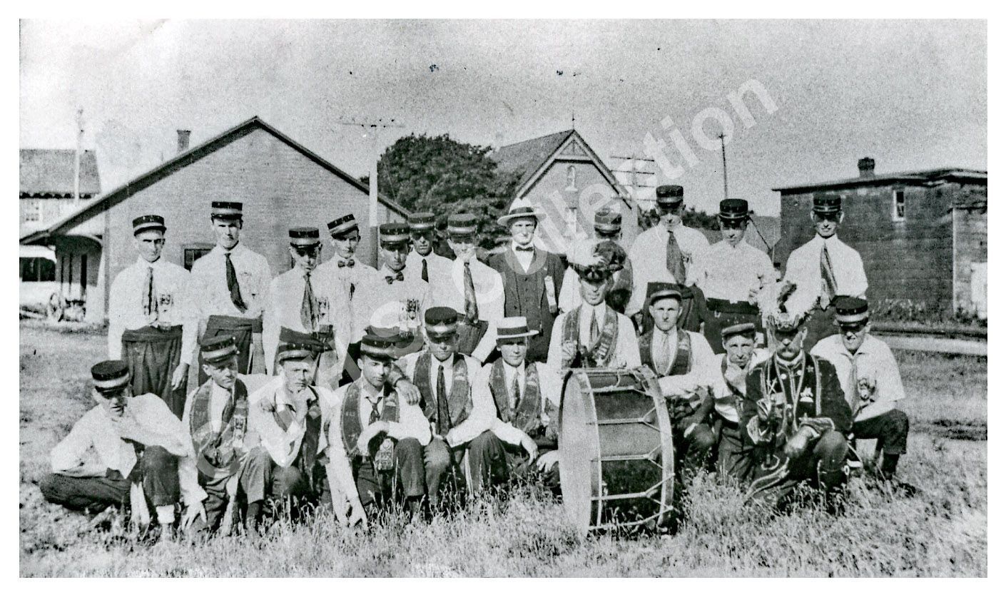Photograph of the Orange Young Britons (O.Y.B.) #74, Stittsville located at the Stittsville Train Station. Photograph taken approximately 1920.