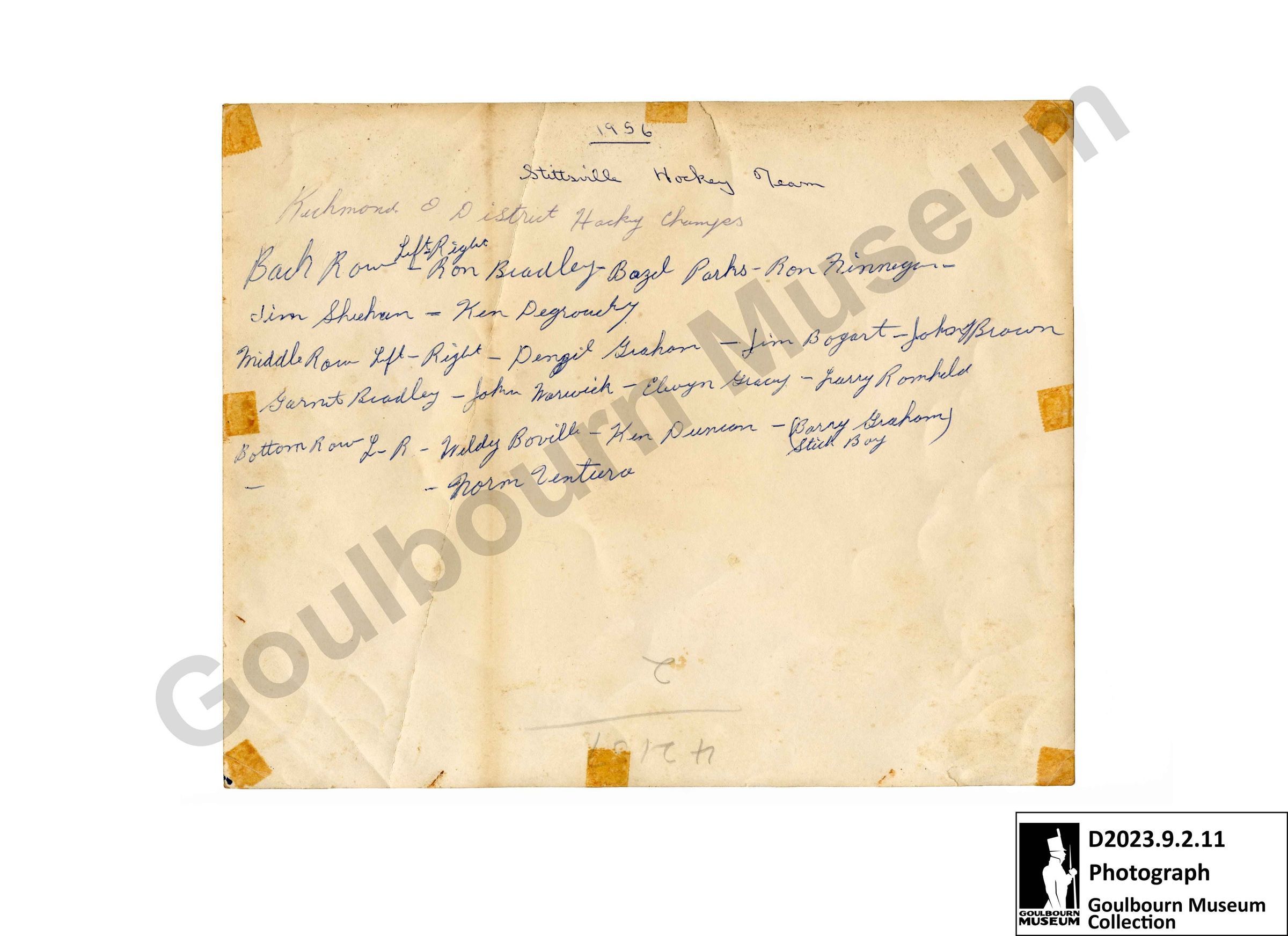 One photograph of the Stittsville Hockey Team and their stick boy (bottom row, center), 1956.Photograph Details
