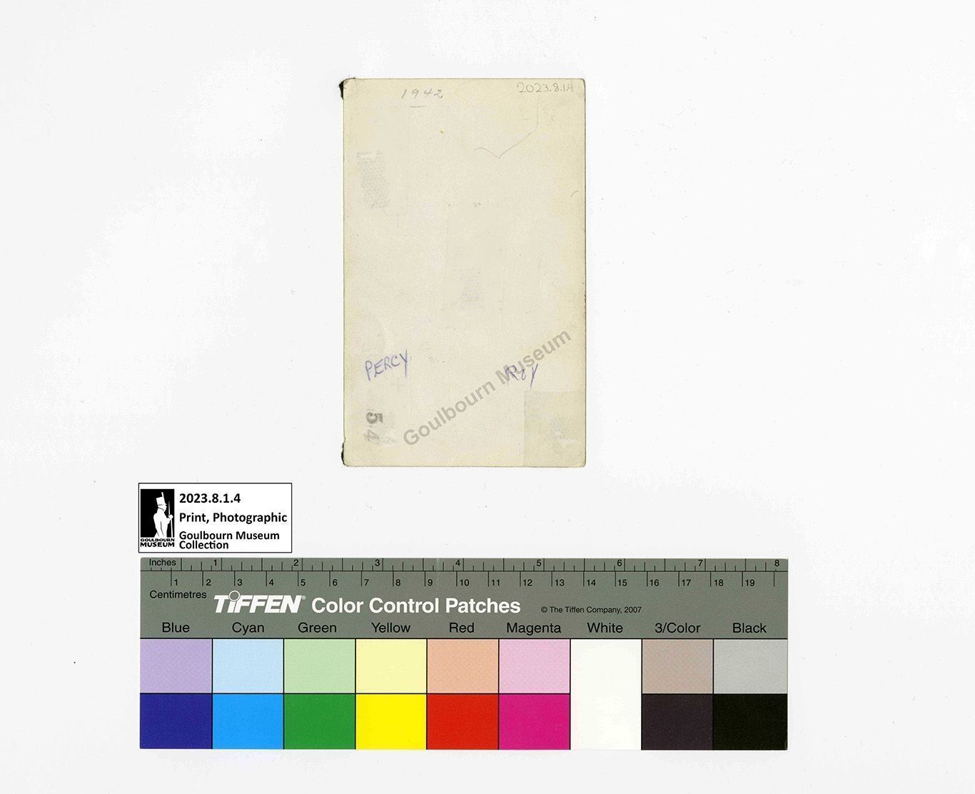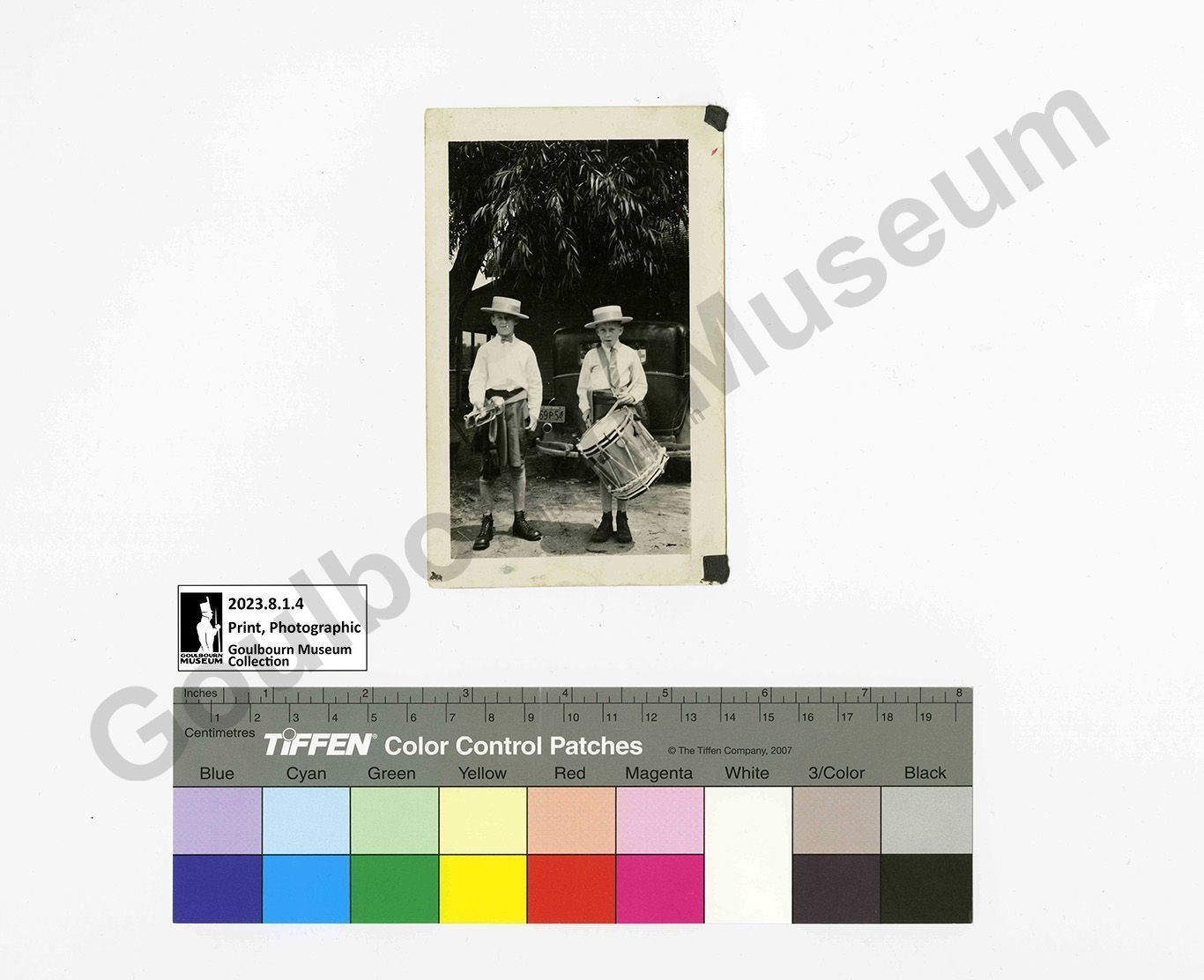 Photograph taken in 1942 of Roy McCooeye and his brother Percy McCooeye as children. Both boys were members of the Orange Young Britons and were participating in an event at the time of this photograph. Roy is located on the left and is holding a bugle. Percy is located on the right and is playing a drum. The photo is taken outdoors. A car is visible on the right and a tree is visible on the left. Both boys are wearing brimmed hats, white long sleeve button shirts, fitted grey pants, and black lace boots. The back of the photo features the date "1942" on the top left. The name "Percy" is written on the left, and the name "Roy" is written on the right. The number "54" is stamped in black ink on the left.Photograph Details