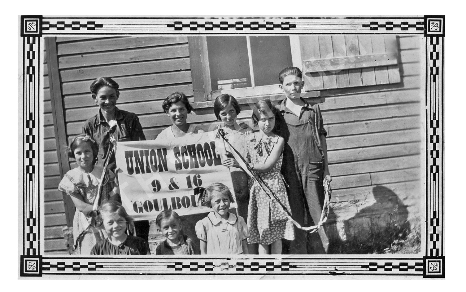 Students photographed holding a Union School Banner c. 1937. At a central location on Lot 3 Concession 12 of Goulbourn on the 1863 map is a school house - Union #9 Huntley and #16 Goulbourn. Children attended from Beckwith, Ramsay, Huntley and Goulbourn townships. Closed in 1938 The first log structure was replaced by a frame building in 1898.Collection