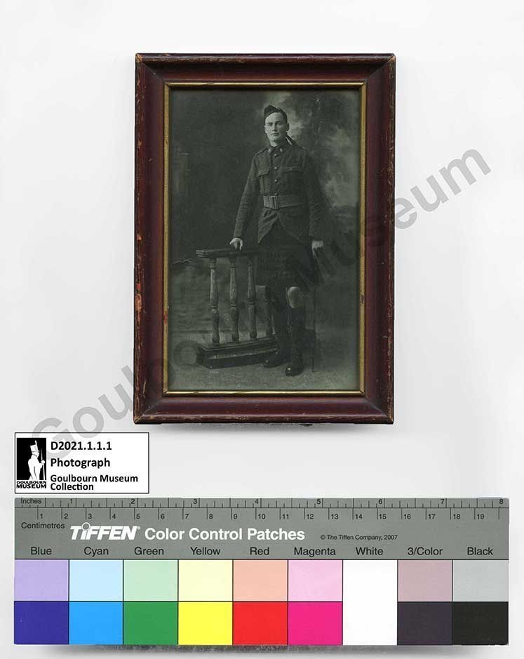Framed black-and-white studio portrait of Private Sefton Stewart of Richmond, Ontario. He is dressed in his First World War military uniform, which includes a Glengarry cap, tunic, belt, kilt, hose, and shoes. Sefton stands with his right hand resting on a studio prop and his left hand holding a walking or pace stick. The photograph is believed to have been taken in France, where Sefton adopted the Highland uniform while serving with the Canadian Expeditionary Force.Photograph Details