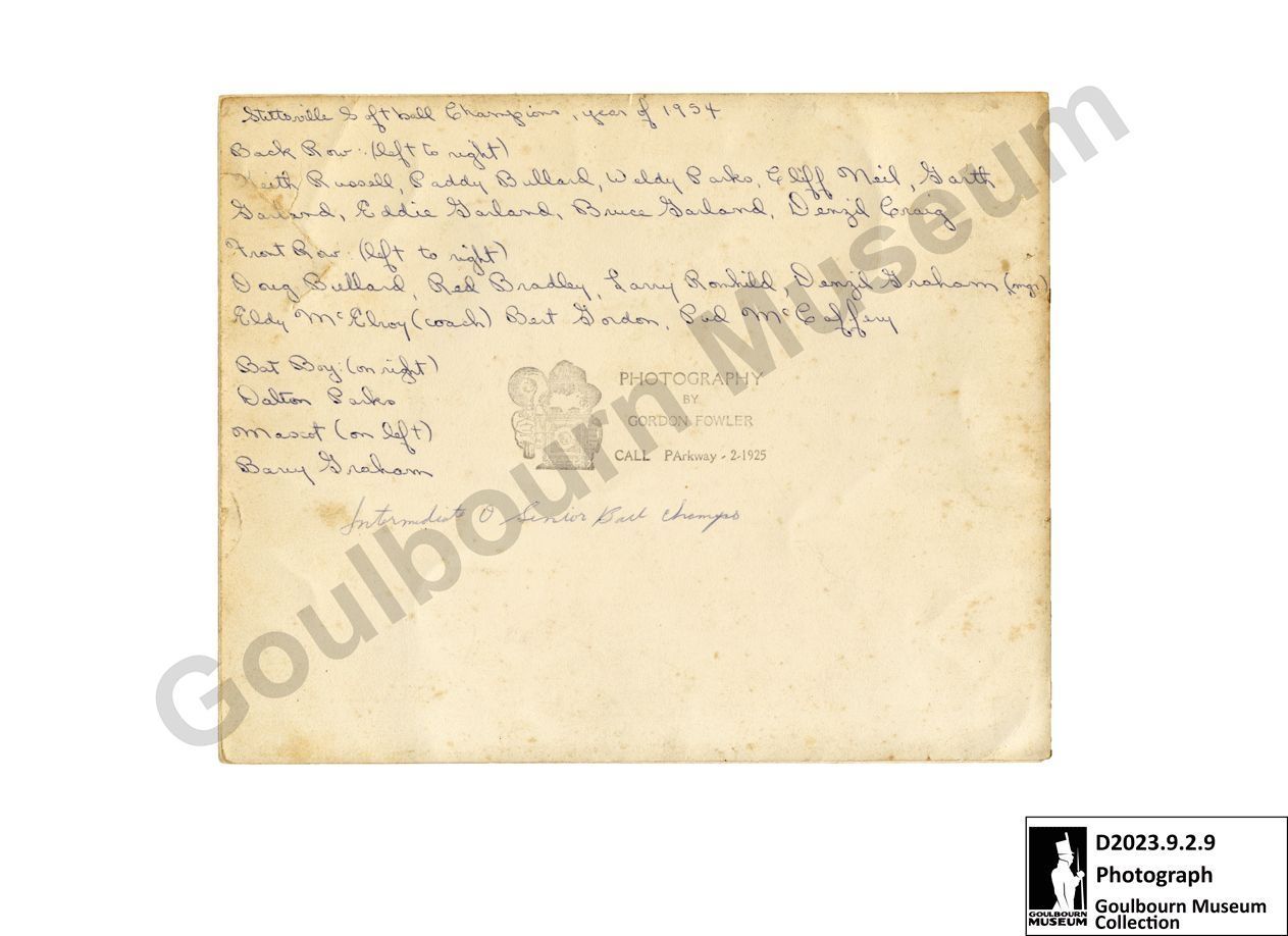 Red Bradley's Sports achievements: 1949 Eastern Ontario Amateur Softball Association, Stittsville Intermediate Champs, 1950 Eastern Ontario Men's Intermediate Softball Champs, 1952 Eastern Ontario Senior A Softball Champions, 1954 Eastern Ontario Senior A Softball Champions, 1954 Stittsville Senior City Champions, 1956 Ontario Amateur Softball Association Senior A Champions, 1996 Stittsville 56'ers were inducted into the Goulbourn Sports Wall of Fame, 1955-1956 Rideau District Hockey Champions.Collection