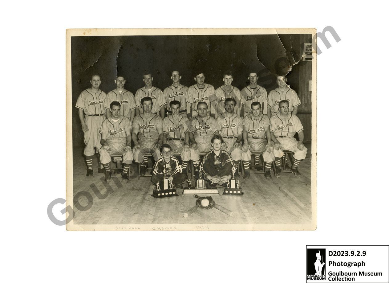 one photograph featuring 15 young men of the Stittsville softball team with their bat boy and mascot, 1954. On the floor in front of the two boys are three trophies, two bats, and a softball inside a catcher's glove.Context