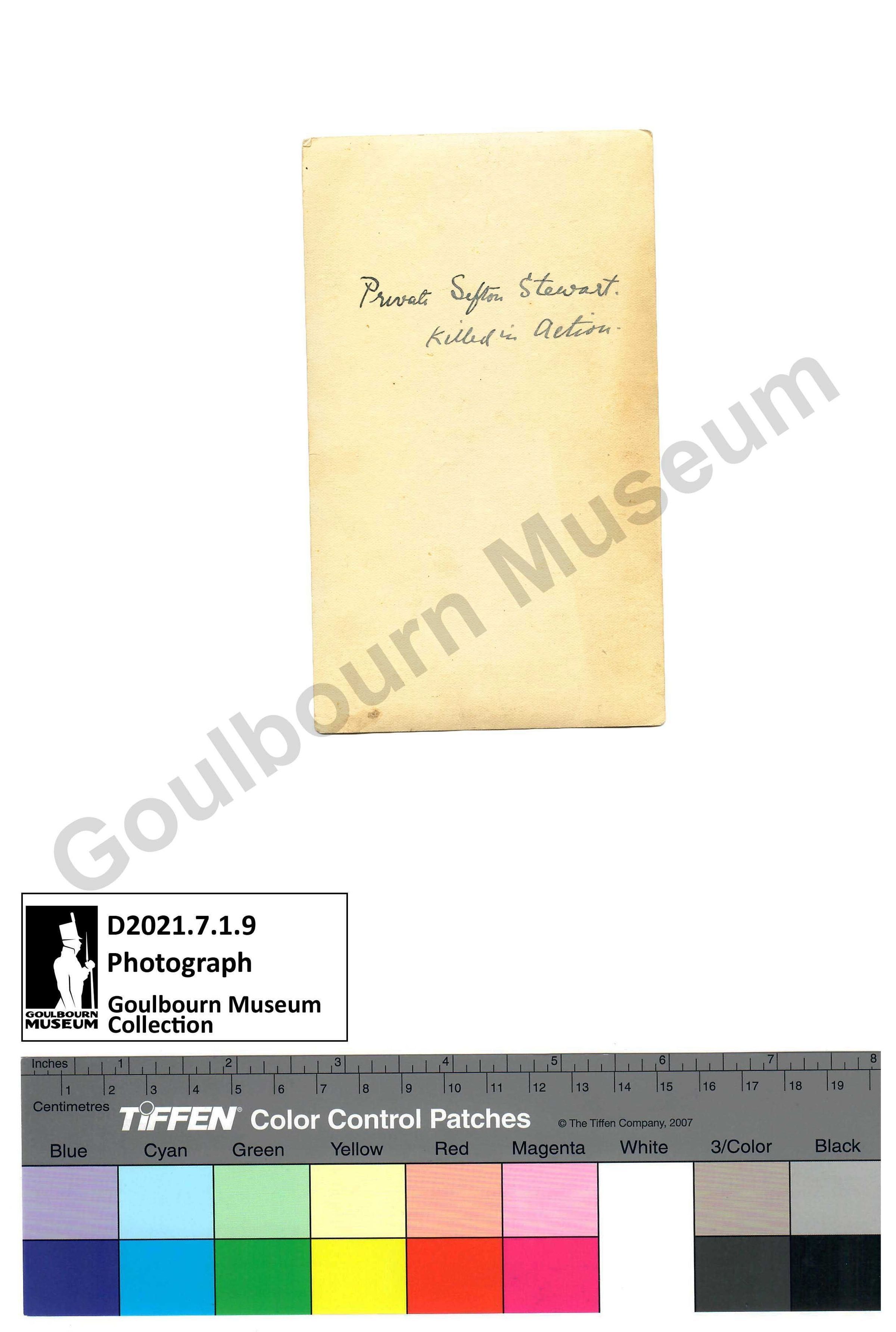 Studio portrait of Pte. Sefton Stewart in military uniform. Sefton is in a partially seated position holding a field cap and what is presumed to be a swagger stick across his lap. Sefton is wearing a wool jacket that has a flat collar, shoulder flashes, two breast pockets, and metallic button closures. Two collar badges (metal badges that identified military regiments) are affixed to the left and right of the collar closure. There is a leather belt over the jacket and located at Sefton's natural waist. Sefton's legs are not included in the portrait below the knee. The field cap has a cap badge or hat badge which would identify his affiliation with a specific military regiment. The reverse of the card has an inscription written in dark coloured ink that reads, "Private Sefton Stewart / killed in action." Sefton Stewart was a member of the Canadian Expeditionary force and served during the First World War from 1916-1918. Sefton was a resident of Richmond, Ontario.Subject Person/Organization