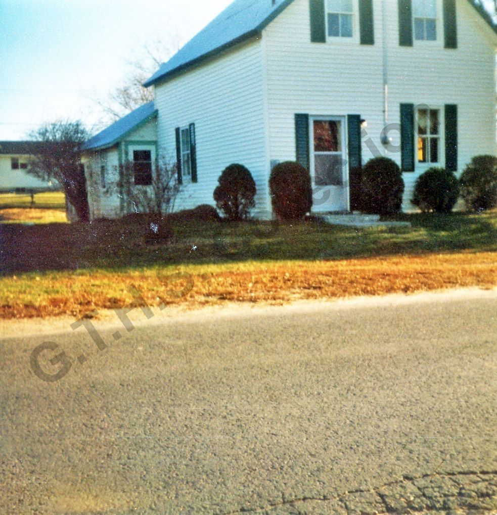 The image depicts a two-story white house with a sloping roof and green shutters, set slightly back from the road and surrounded by well-kept shrubs and a grass lawn that transitions into the asphalt of the foreground street. In the background, a few leafless trees indicate a colder season, and the sun casts a warm glow across the scene, suggesting either morning or late afternoon light.