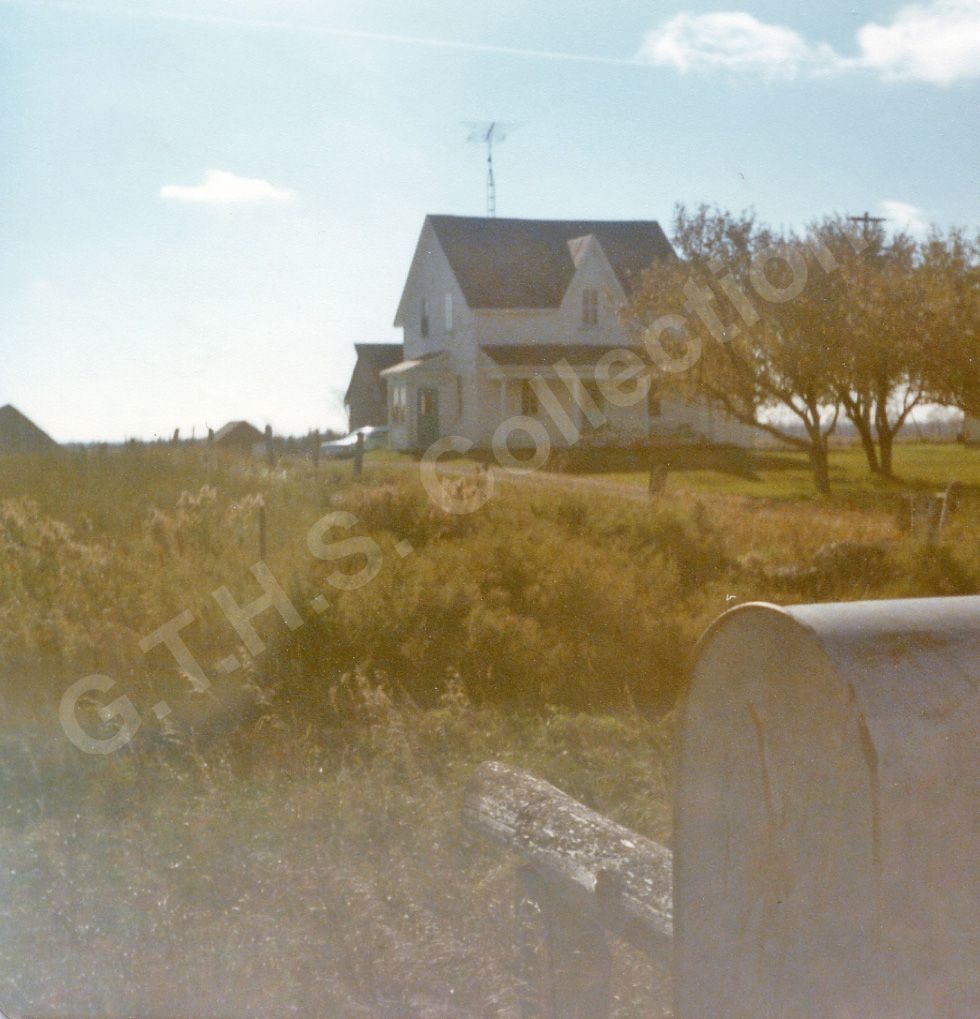 The image depicts a rural scene featuring the Trimble Family home, a two-story house with a white exterior and dark roof, framed against a bright, blue sky with a few scattered clouds. Two trees stand to the right of the house. In the foreground, a weathered mailbox rests near the edge of a grassy field that stretches toward the house.