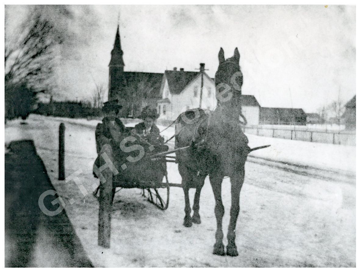 Photograph of two women seated in a one horse sleigh on McBean St., Richmond. In the background the Presbyterian Church and Manse are visible.
