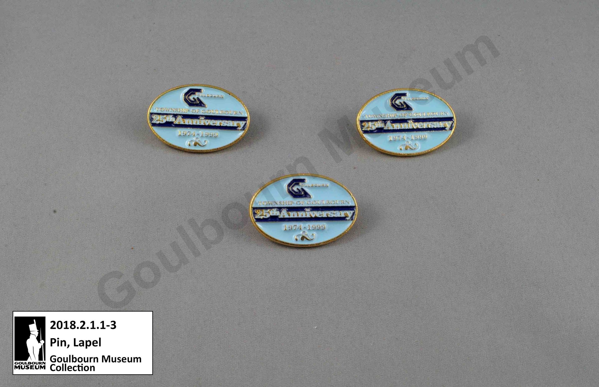 Series of three identical metal lapel pins created for the 25th Anniversary of Goulbourn Township. The top of the pin has the Goulbourn Township logo, below is the inscription, "Township of Goulbourn 25th Anniversary 1974-1999". The pin is comprised of a golden yellow coloured metal, raised lettering and details on the front surface which have recessed dark and light blue paint, and a post to secure the pin and accompanying clasp to secure the pin on the reverse.Context